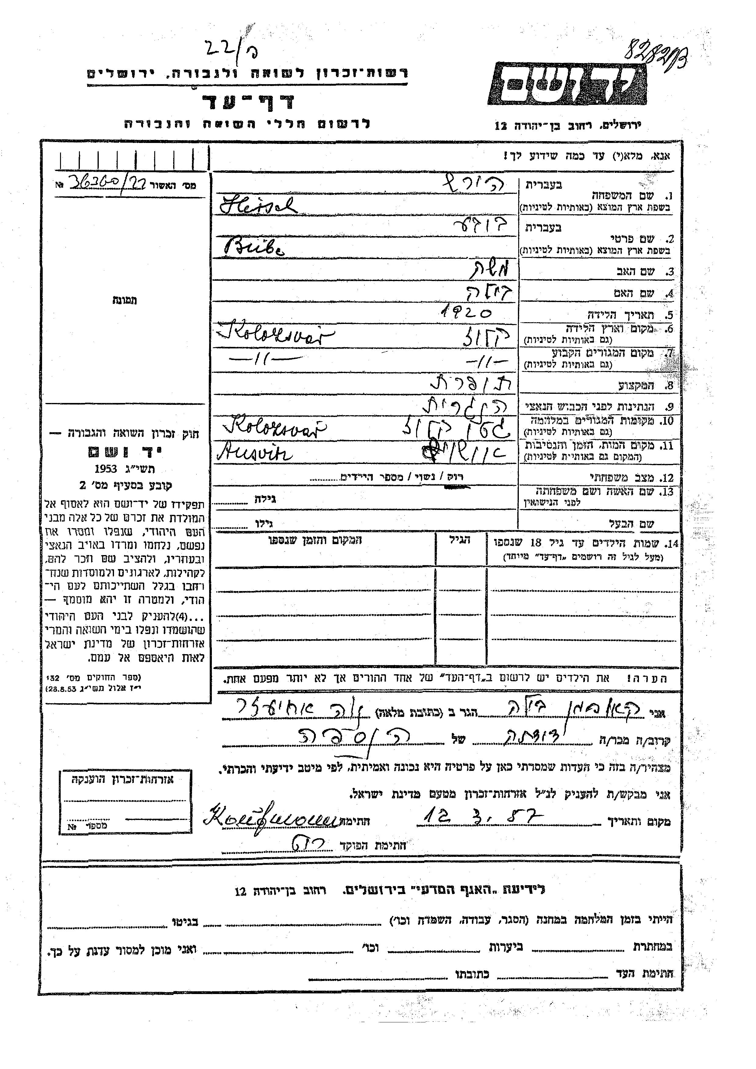 Бубе Херш Хирш, место рождения: Колошвар, Румыния. Отец: Моше, mать:Била. Швея. Холост / не замужем. Место жительства до войны: Колошвар, Румыния. Место во время войны: Колошвар, Румыния.