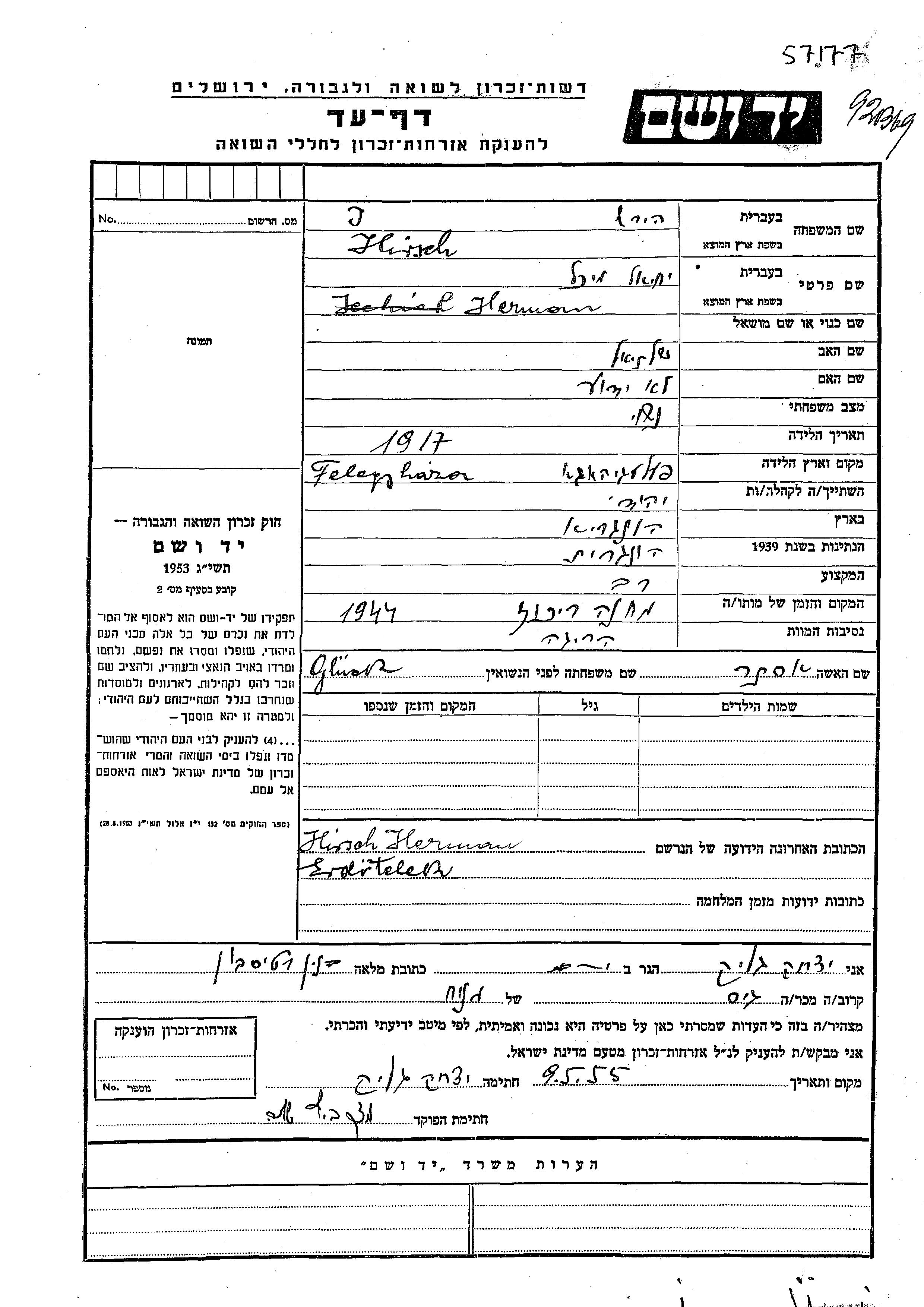 Хирш Херман Йехяль Михель 1917 Эрдётелек, Венгрия Лист свидетельских показаний
