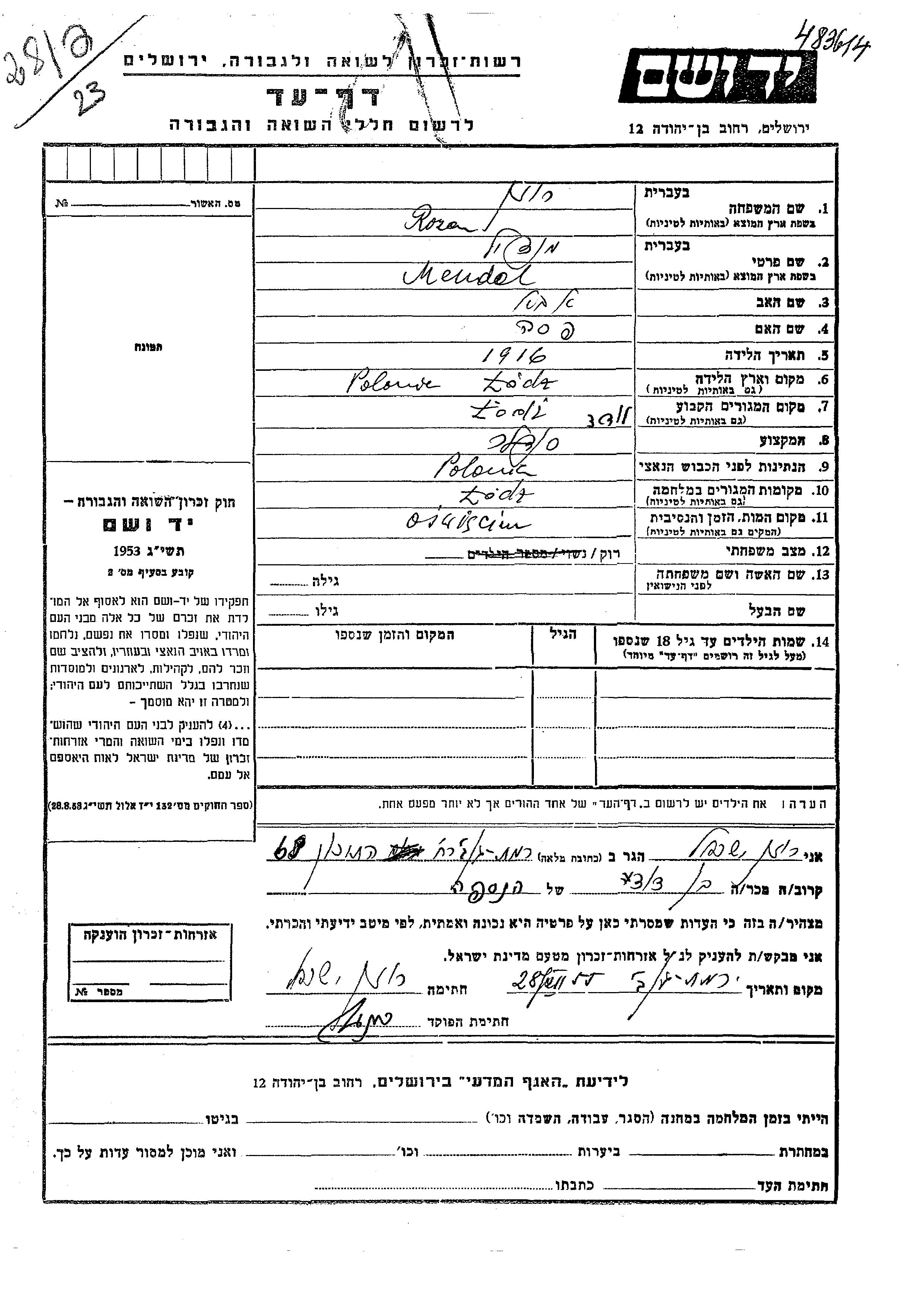 Розен Мендель Мендил 1916 Лодзь, Польша Лист свидетельских показаний