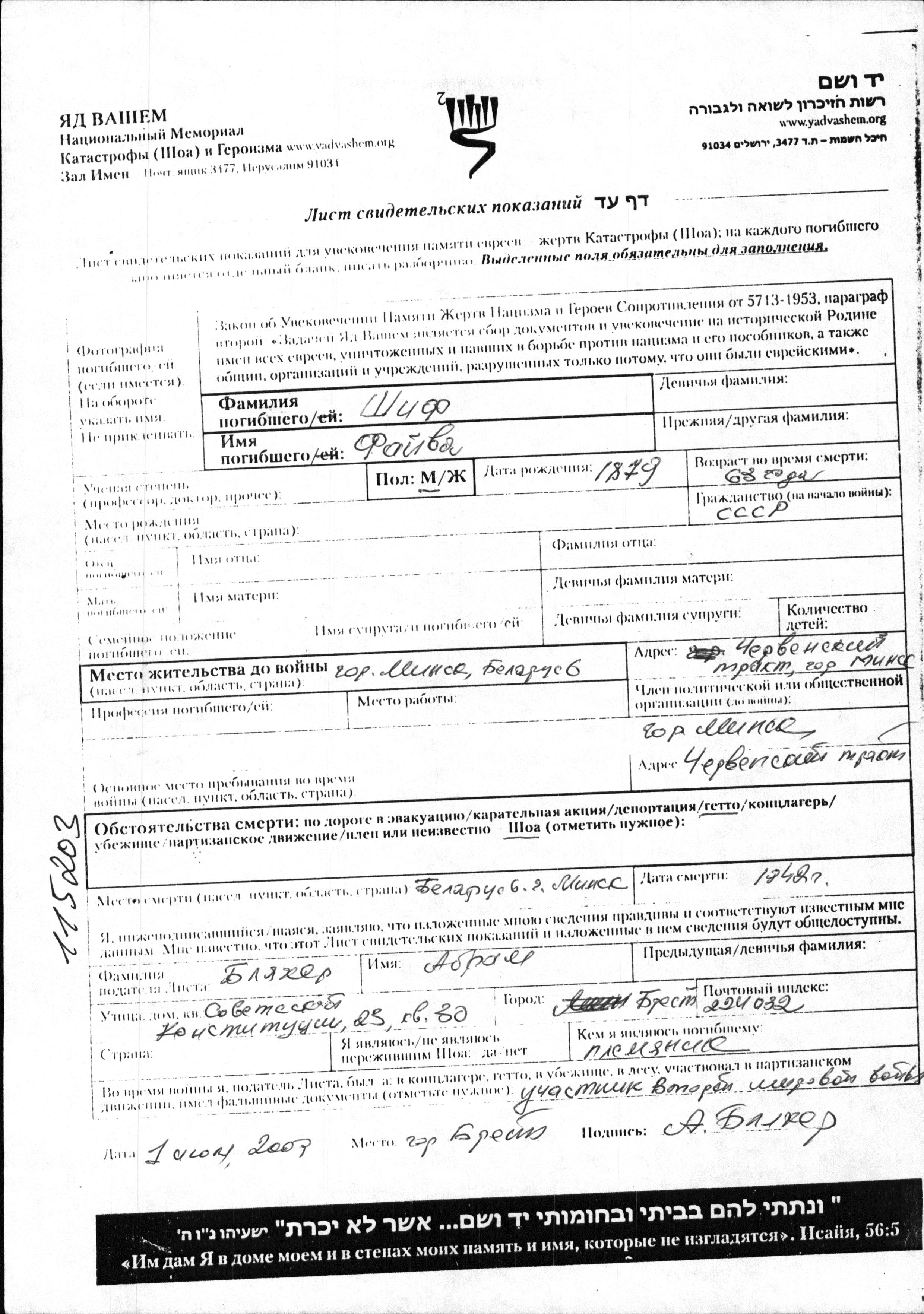 Яд Вашем - Листы свидетельских показаний Мемориального фонда