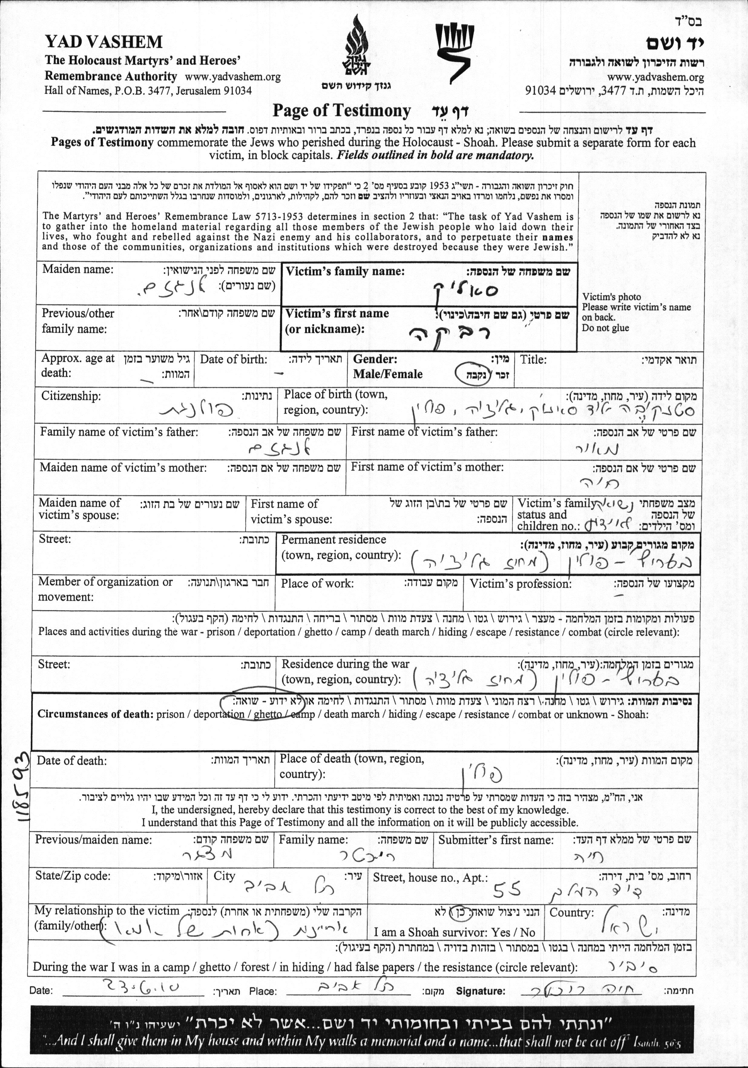 Яд Вашем - Листы свидетельских показаний Мемориального фонда