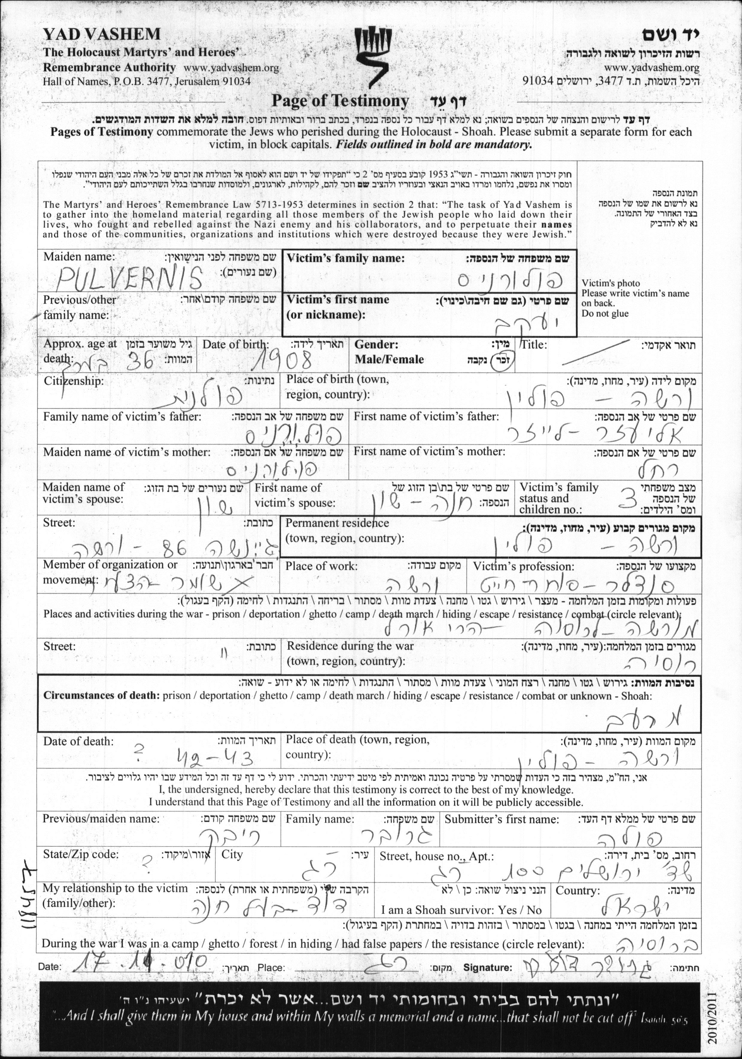 Яков Пульвернис, место рождения: Варшава, Польша. Отец: Элиэзер, mать:Рахель. Сапожник. Женат / замужем. Место жительства до войны: Варшава, Польша. Место во время войны: Ural, Россия (СССР).