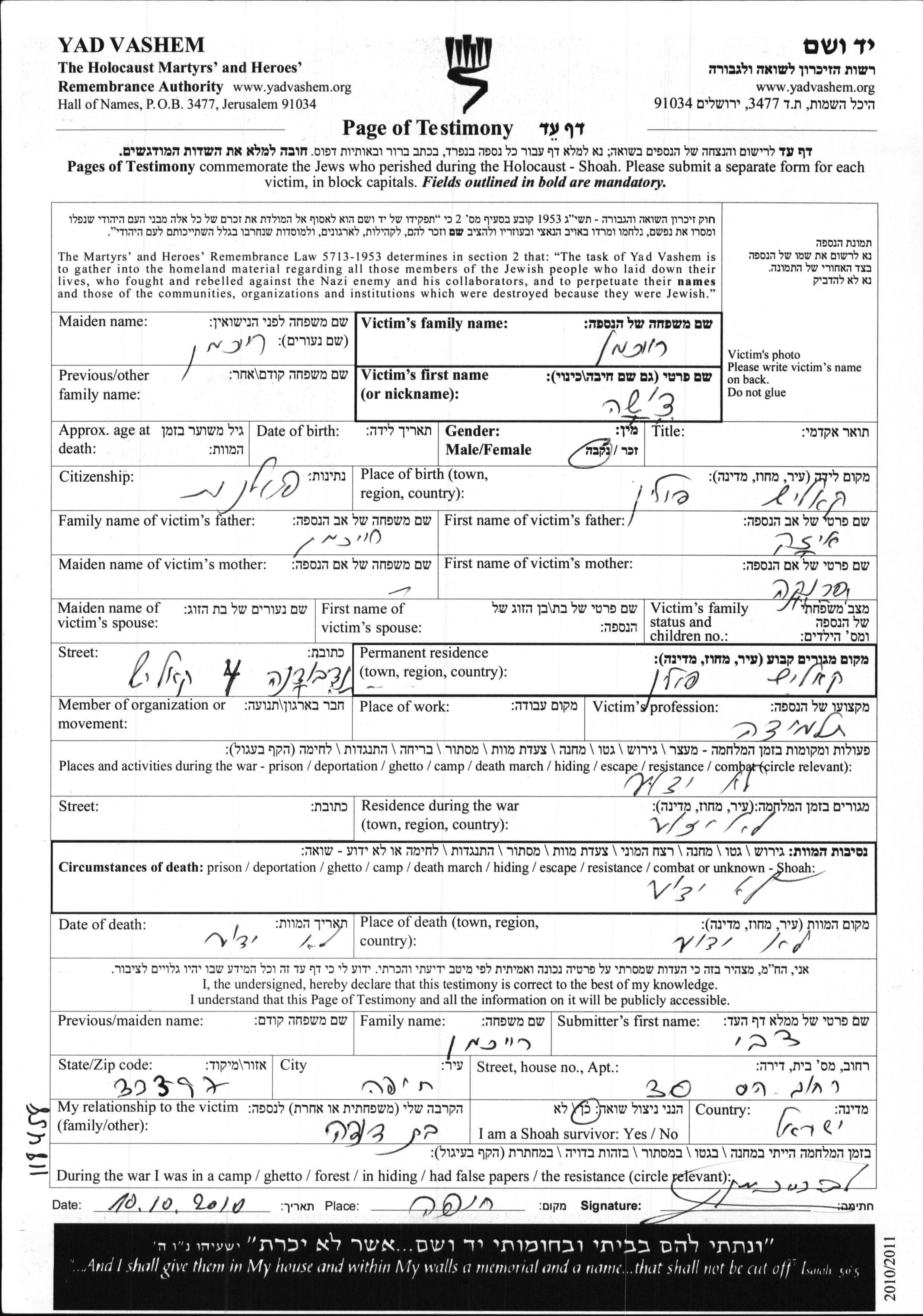Яд Вашем - Листы свидетельских показаний Мемориального фонда