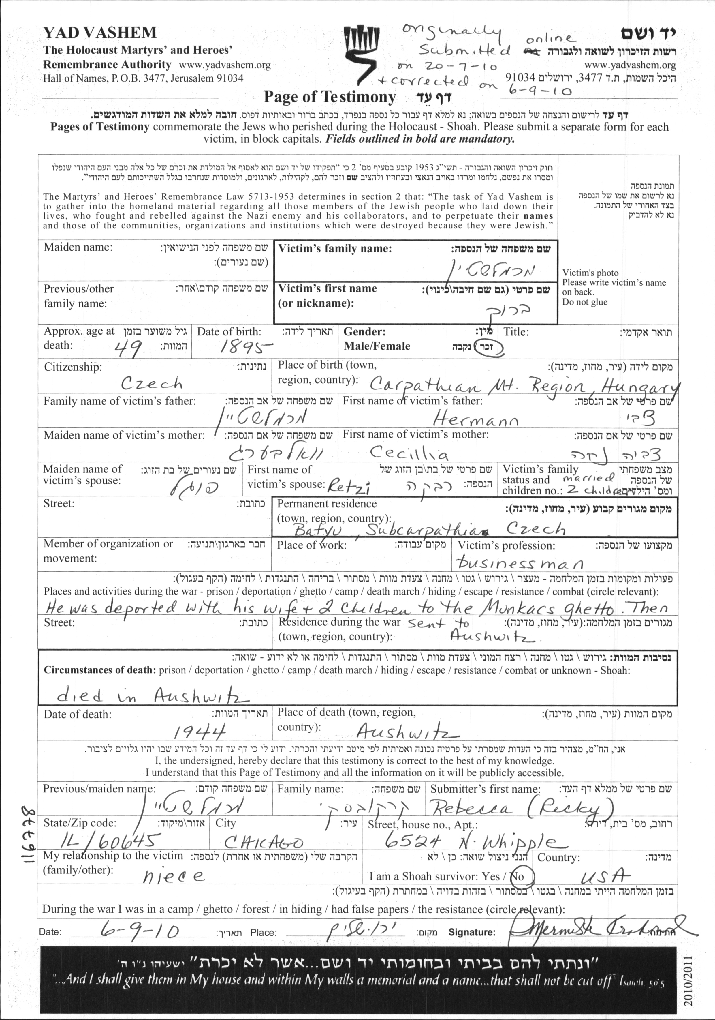 Барух Мермельштейн, место рождения: Закарпатье, Чехословакия. Отец: Херманн Цви, mать:Цецилия Цвия Неха, девичья фамилия Вольберг. Предприниматель. Женат / замужем. Место жительства до войны: Батьу, Чехословакия. Место во время войны: Мункач, Чехословакия.