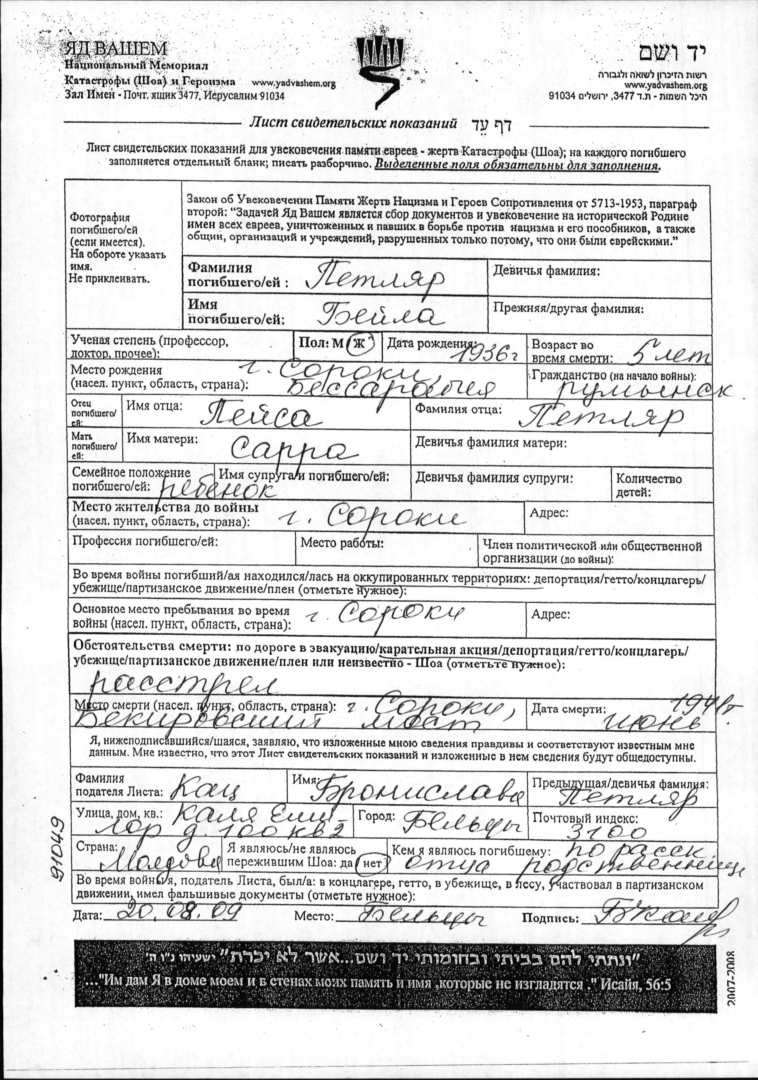 Бейла Петляр, место рождения: Сороки, Румыния. Отец: Пейса, mать:Сарра. Ребенок. Место жительства до войны: Сороки, Румыния. Место во время войны: Сороки, Румыния.