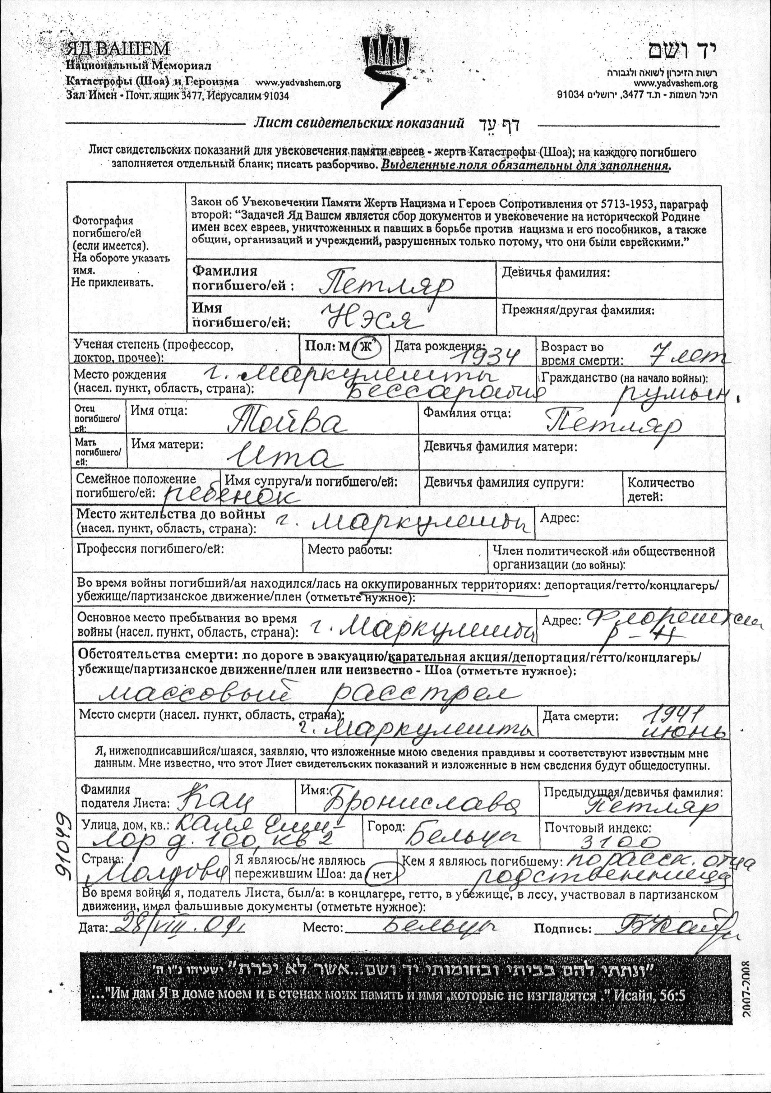 Неся Петляр, место рождения: Маркулешты, Румыния. Отец: Тойва, mать:Ита. Ребенок. Место жительства до войны: Маркулешты, Румыния. Место во время войны: Маркулешты, Румыния.