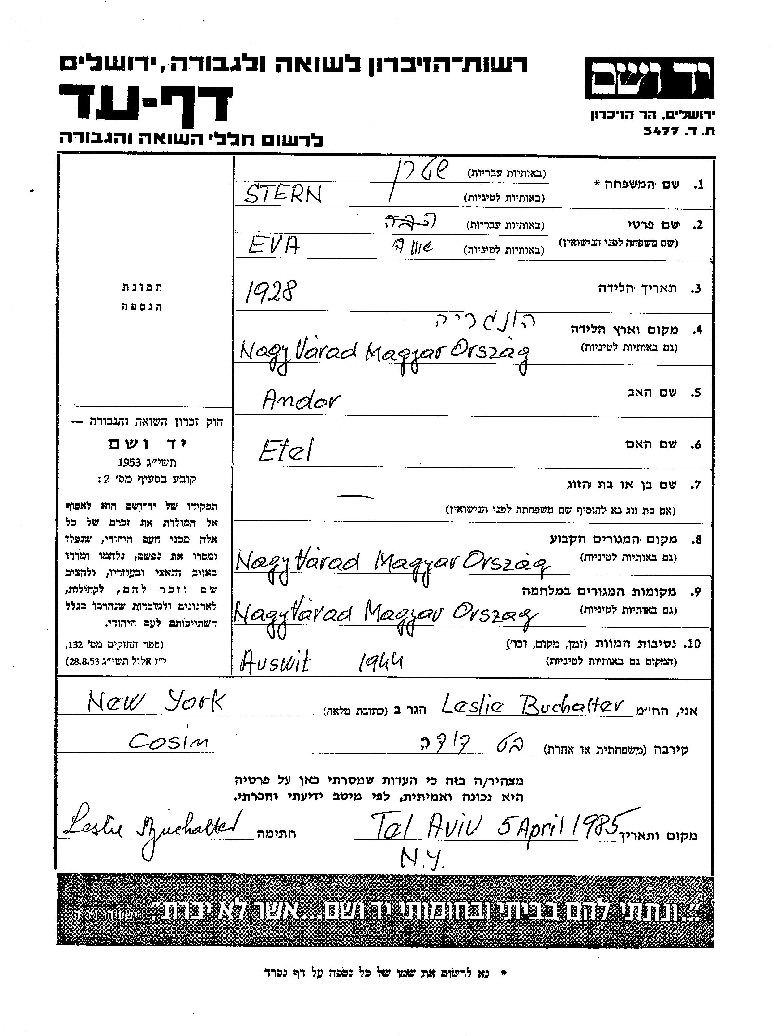 Штерн Эва 1928 Надь-Варад, Румыния Лист свидетельских показаний
