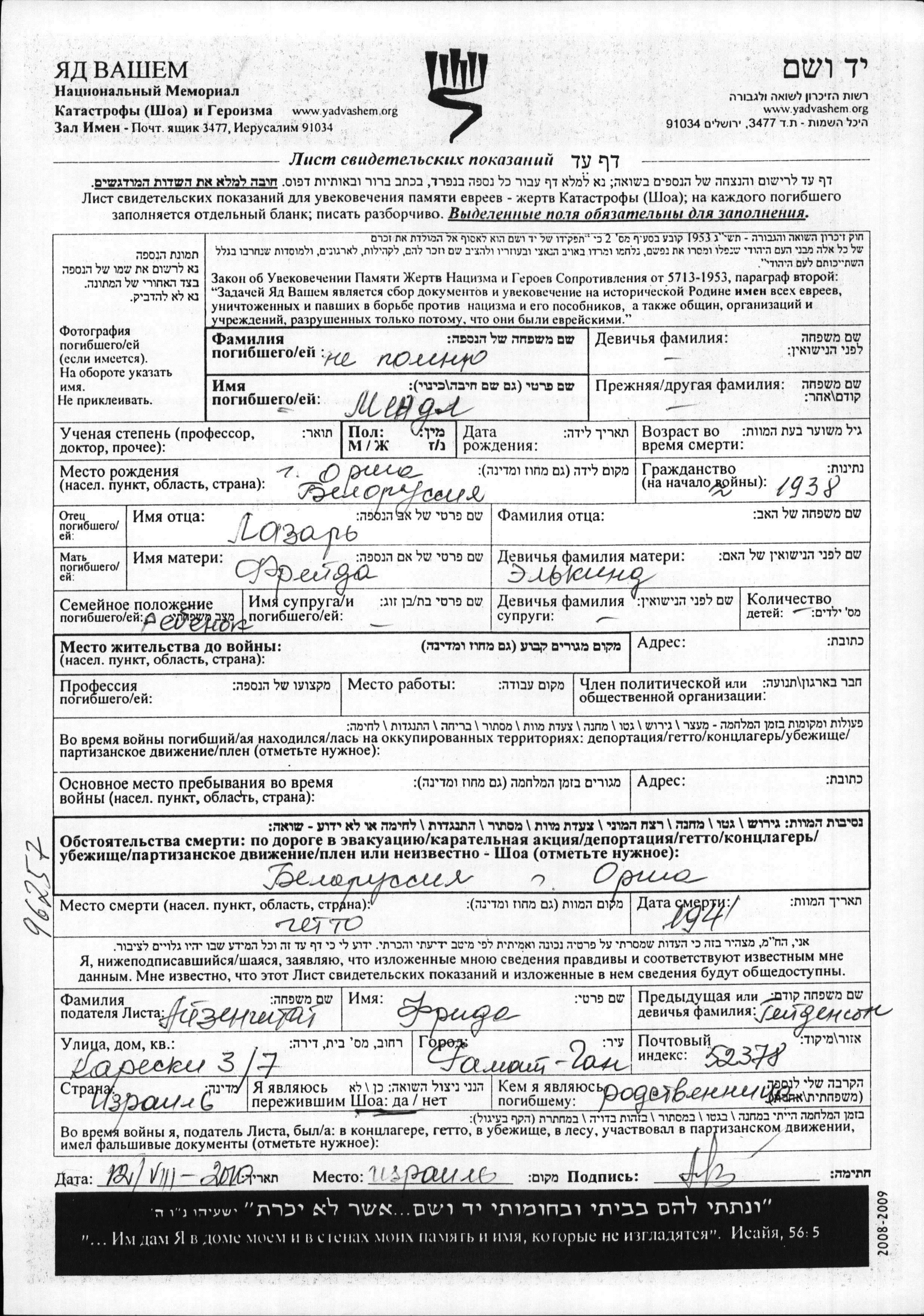 Яд Вашем - Листы свидетельских показаний Мемориального фонда