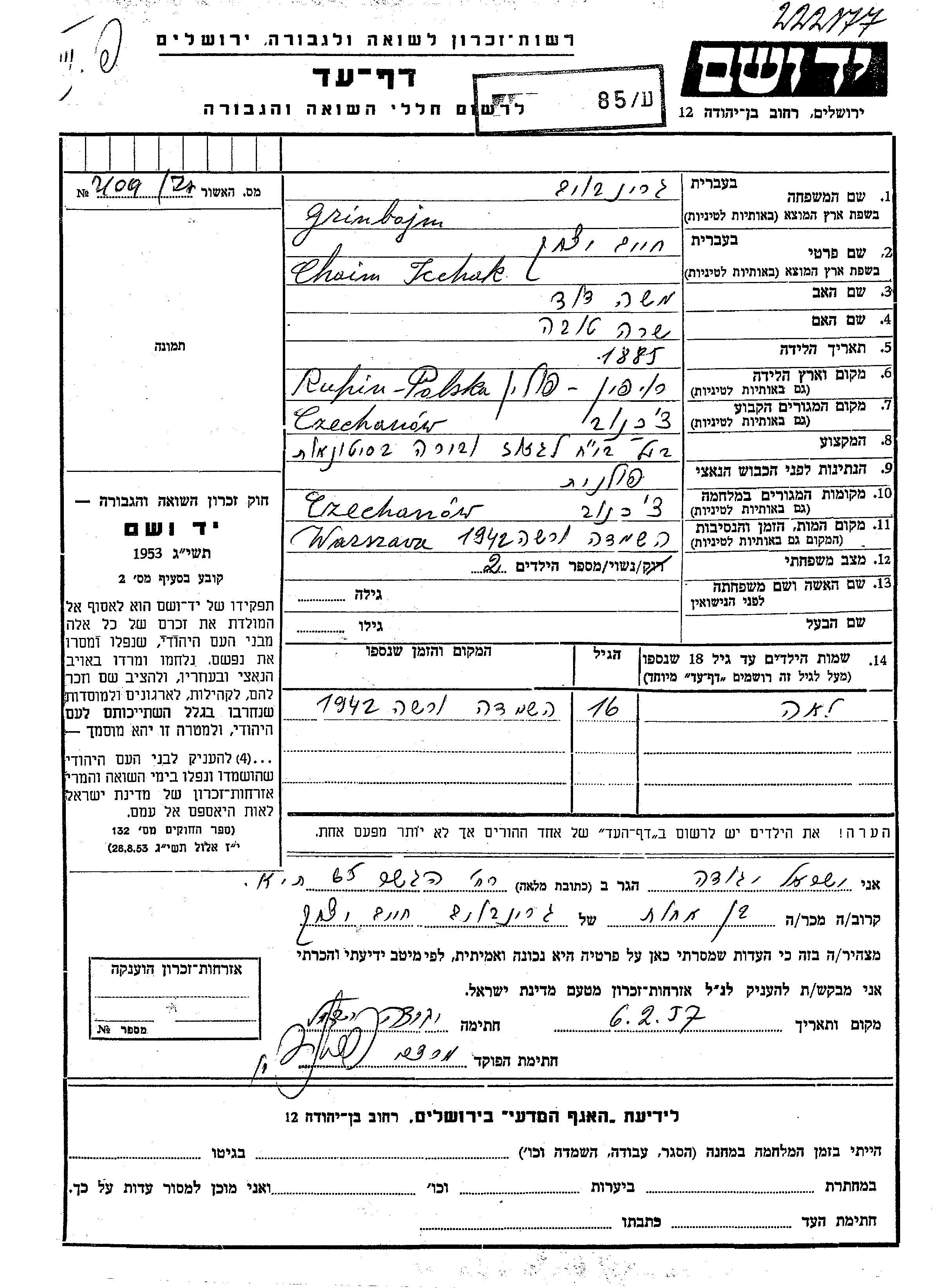 Хаим Ицхак Гринбойм, место рождения: Рупин, Польша. Отец: Моше Давид, mать:Сара Това. Владелец фабрики напитков. Женат / замужем. Место жительства до войны: Чеханов, Польша. Место во время войны: Чеханов, Польша.