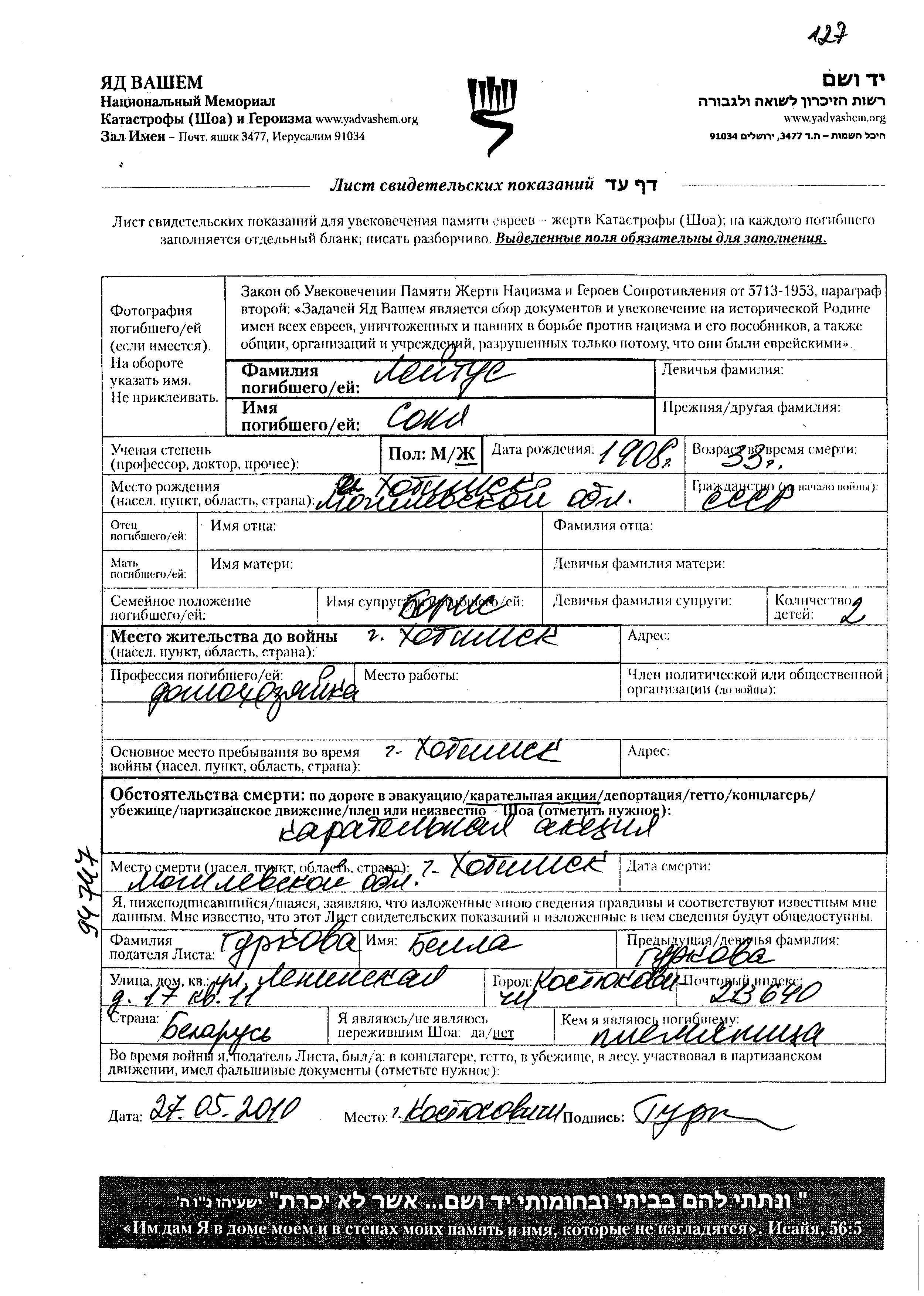 Яд Вашем - Листы свидетельских показаний Мемориального фонда