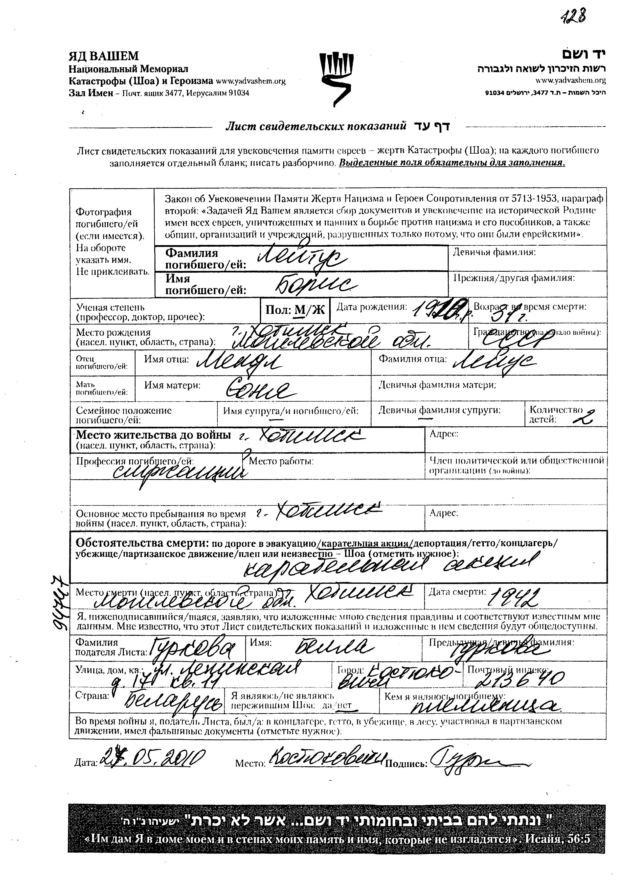 Лейтус Борис 1910 Хотимск, Белоруссия (СССР) Лист свидетельских показаний