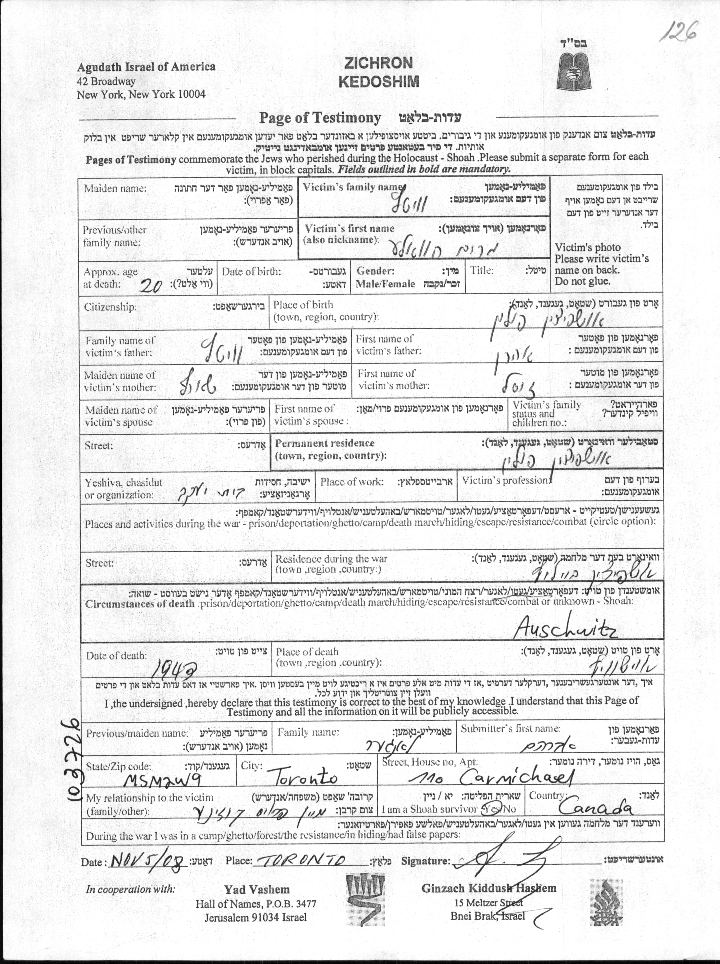 Мейрим Хава Вейц, место рождения: Освенцим, Польша. Отец: Арон, mать:Зисл, девичья фамилия Шварц. Место жительства до войны: Освенцим, Польша.