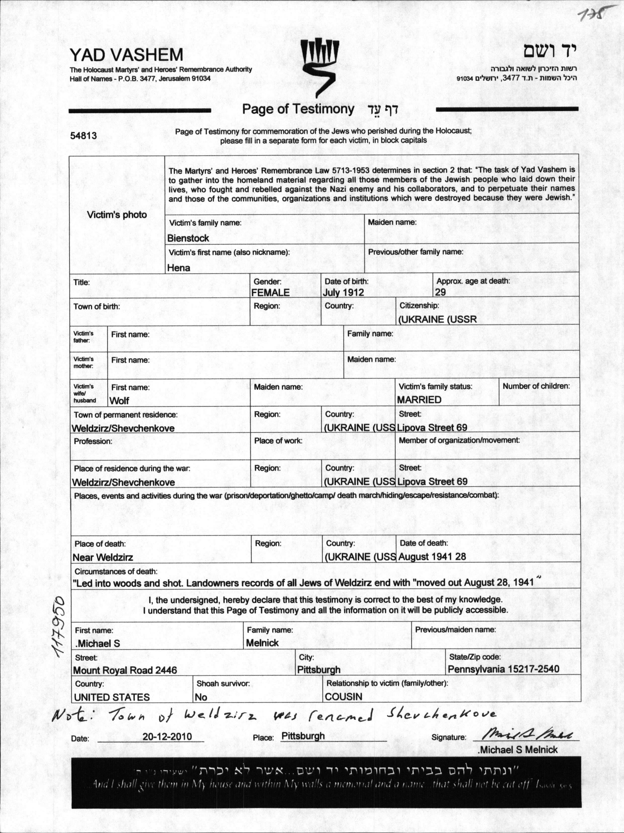 Хена Биншток, место рождения: Украина (СССР). Женат / замужем. Место жительства до войны: Вельдиж, Польша. Место во время войны: Вельдиж, Польша.