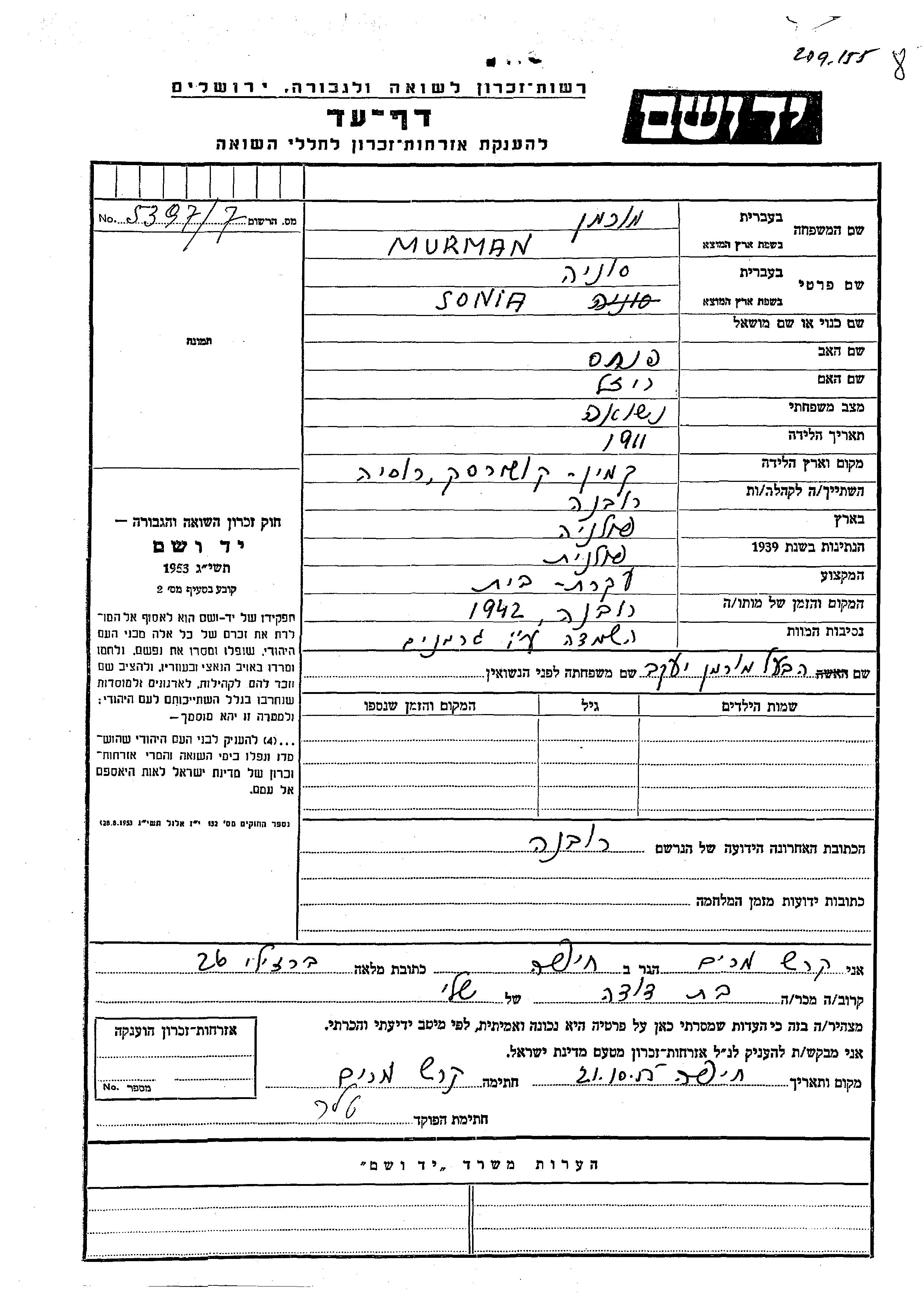 Соня Мурман, место рождения: Камень-Каширский, Польша. Отец: Пинхас, mать:Рейзел. Домохозяйка. Женат / замужем. Место жительства до войны: Ровно, Польша. Место во время войны: Ровно, Польша.