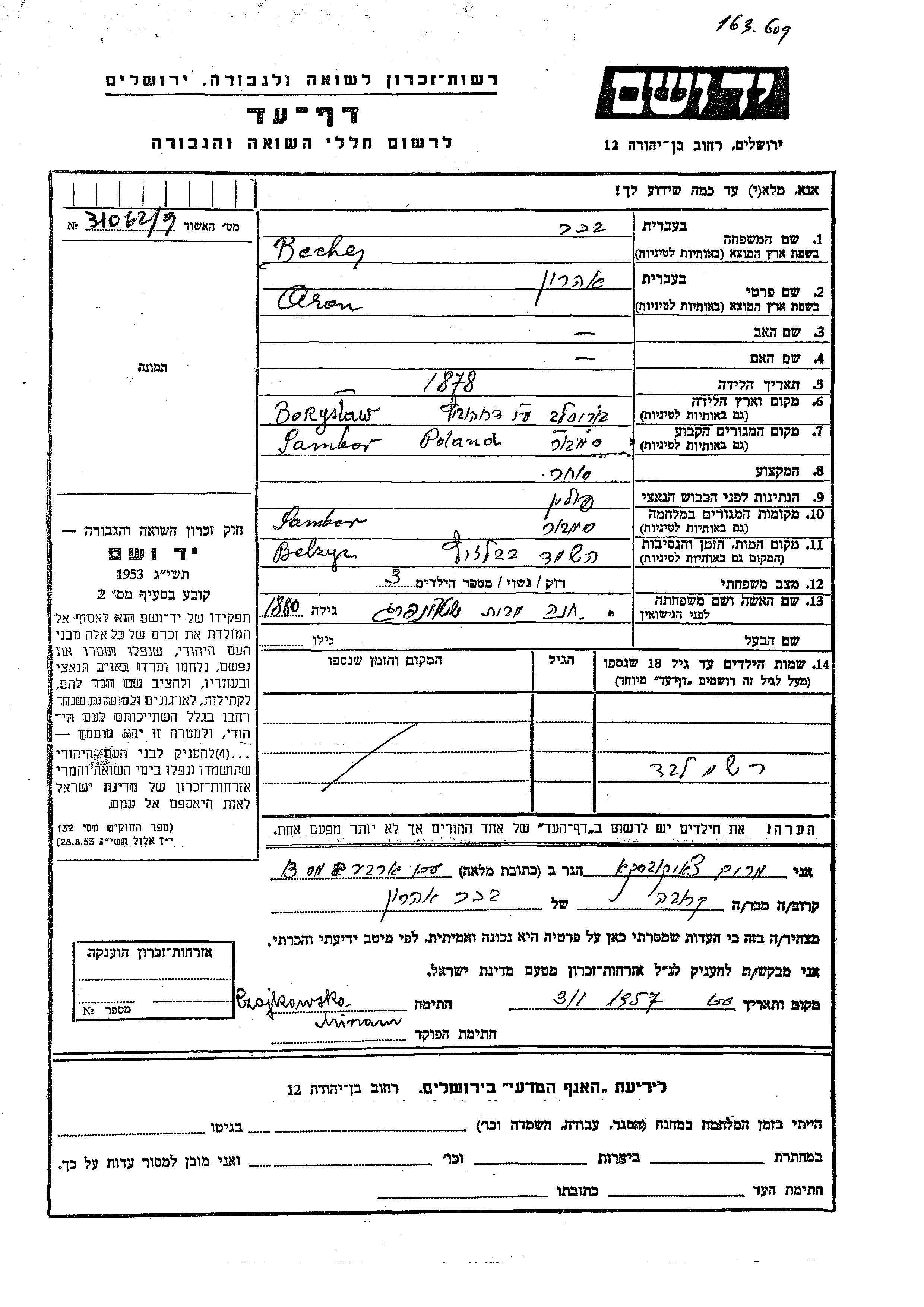 Арон Бехер, место рождения: Борислав, Польша. Торговец / торговка. Женат / замужем. Место жительства до войны: Самбор, Польша. Место во время войны: Самбор, Польша.
