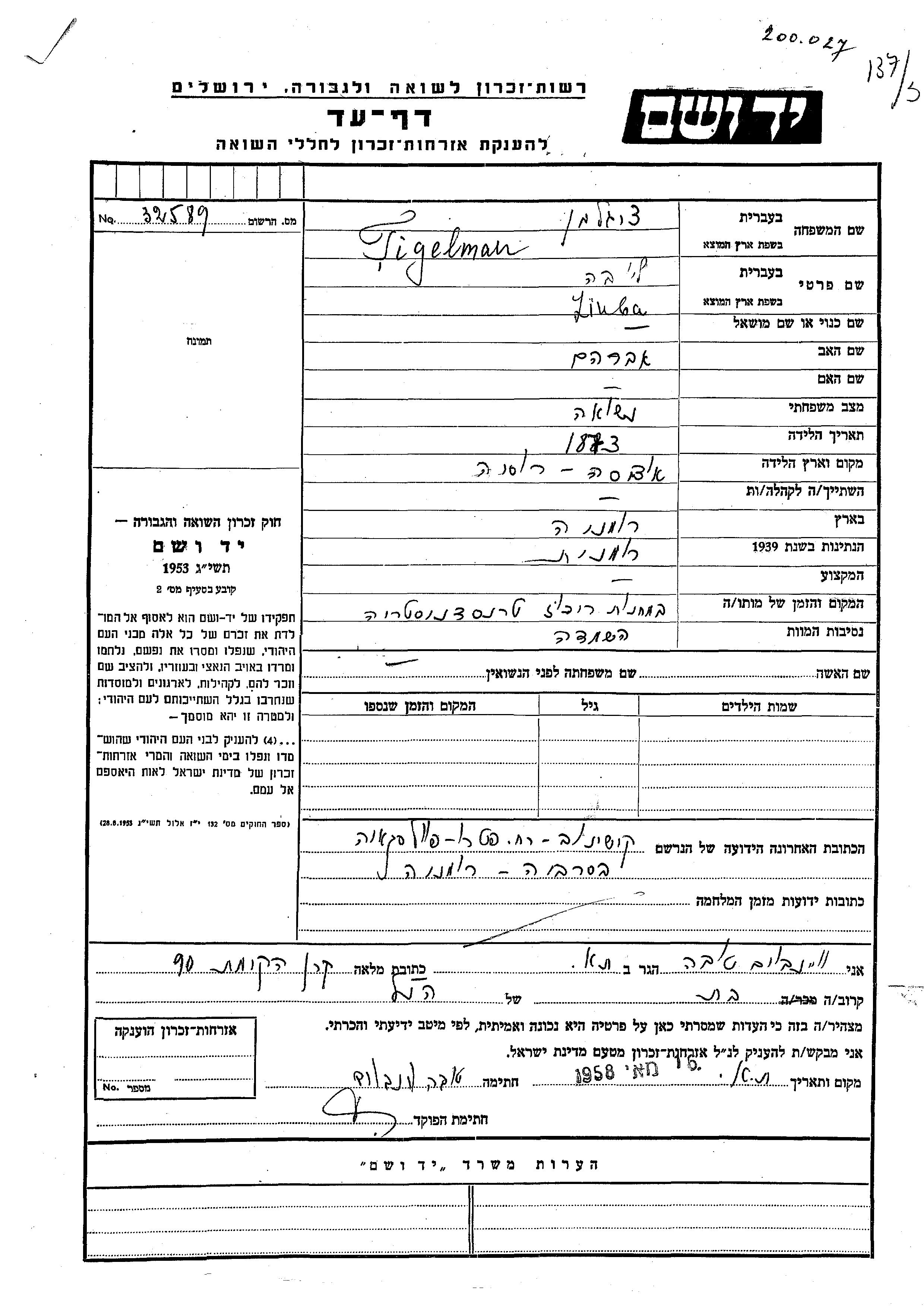 Люба Либа Тигельман, место рождения: Одесса, Украина (СССР). Отец: Авраам. Женат / замужем. Место жительства до войны: Румыния. Место во время войны: Кишинёв, Румыния.