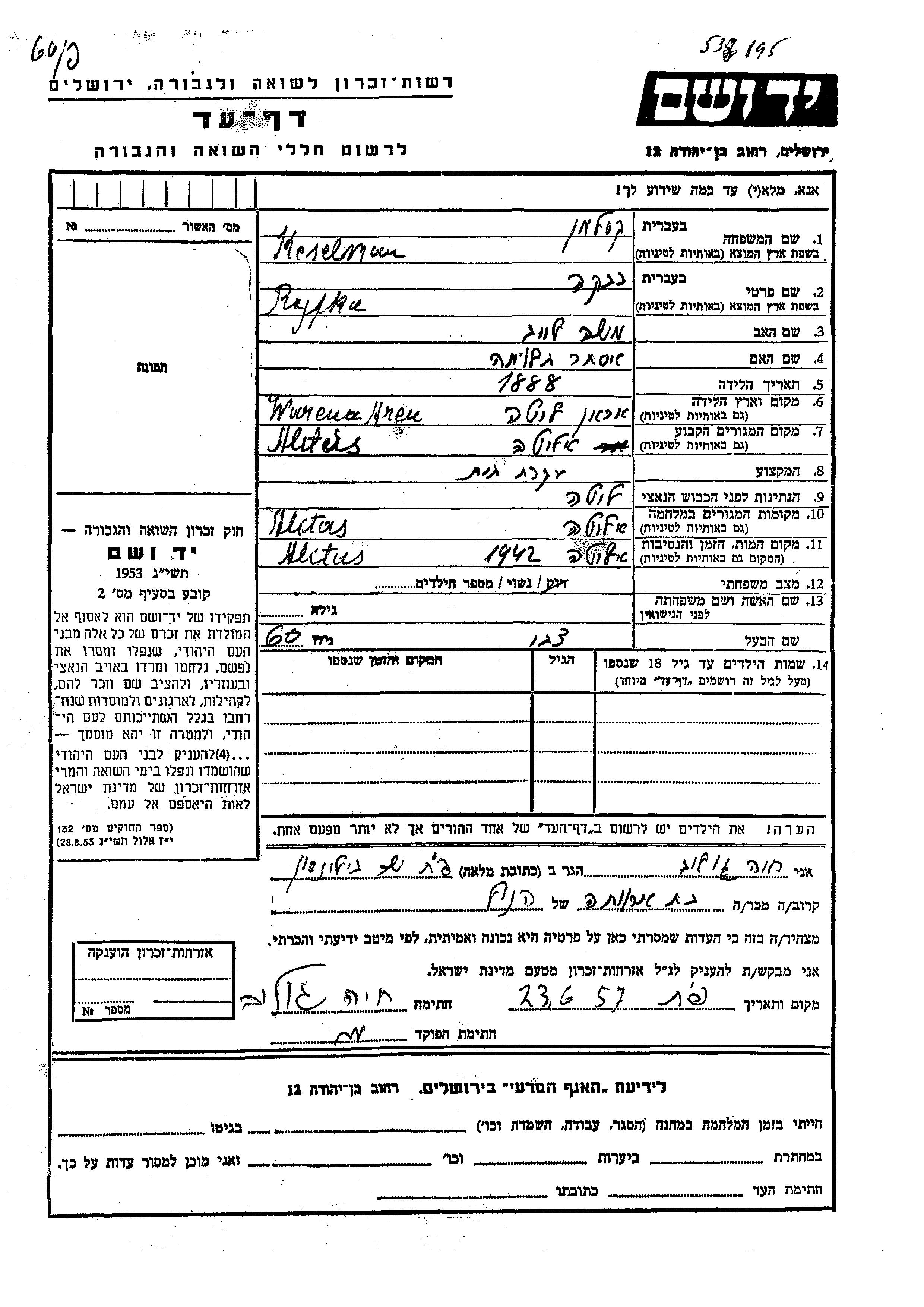 Яд Вашем - Листы свидетельских показаний Мемориального фонда