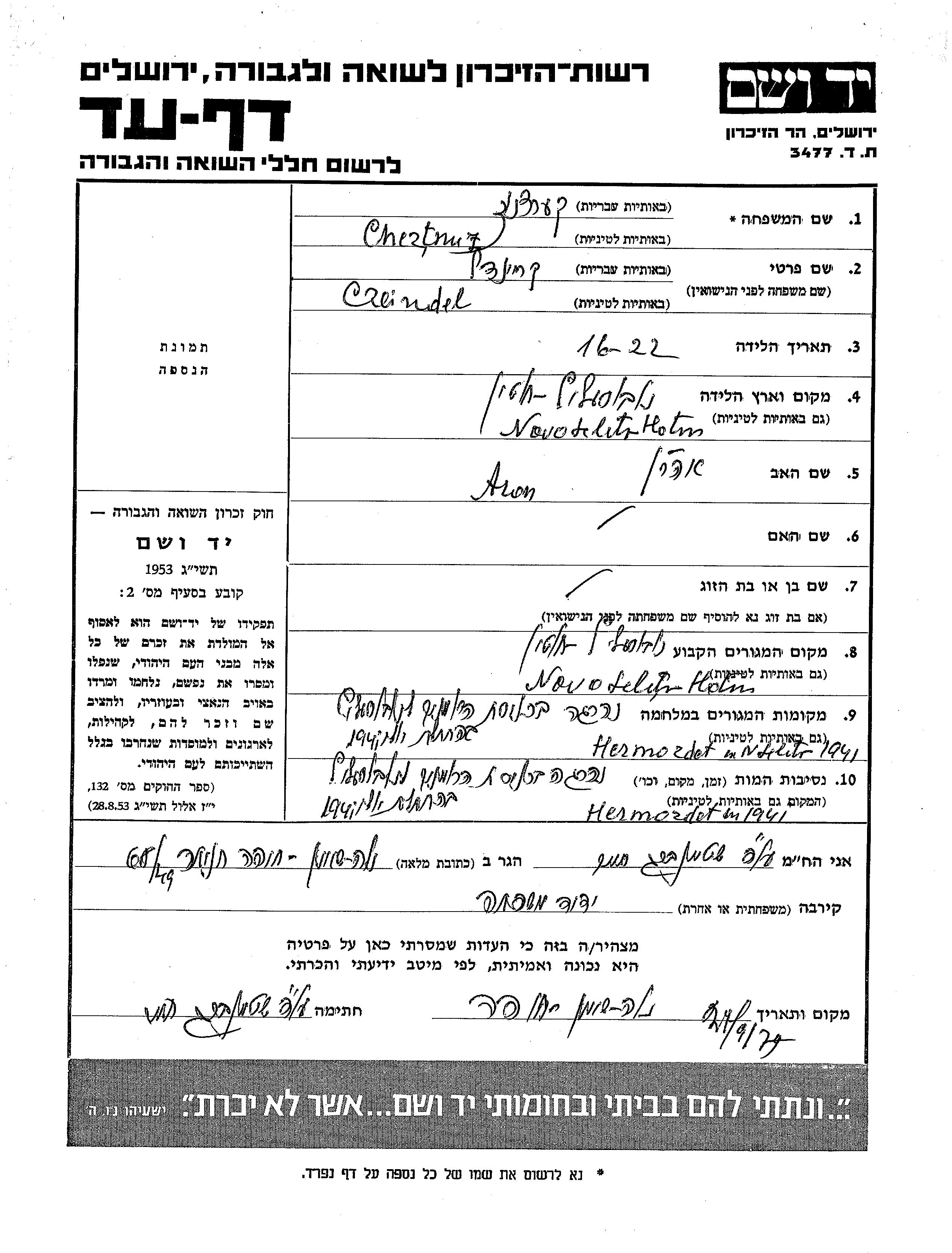 Керцнуз Крейндел Хотин, Румыния Лист свидетельских показаний