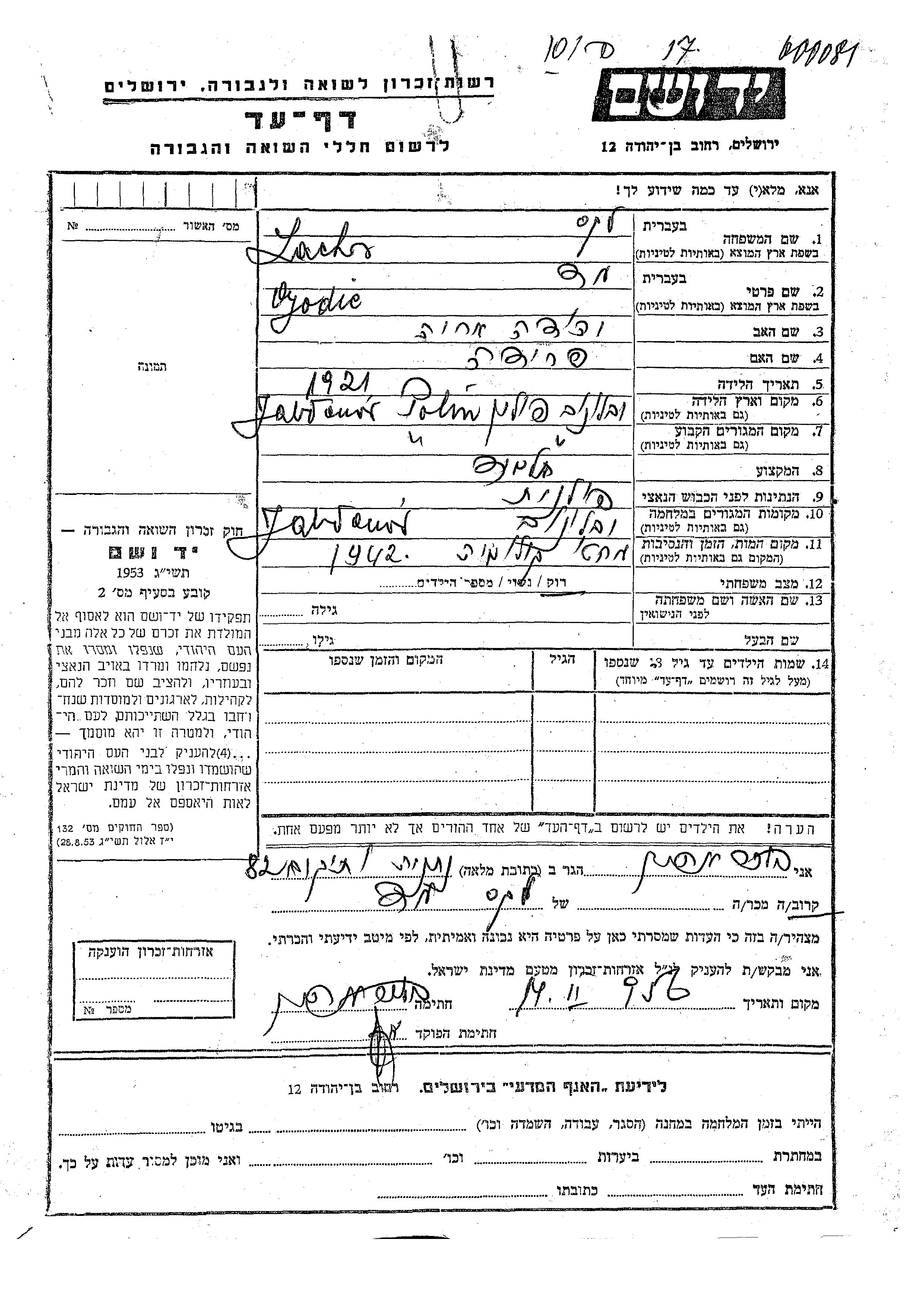 Яд Вашем - Листы свидетельских показаний Мемориального фонда