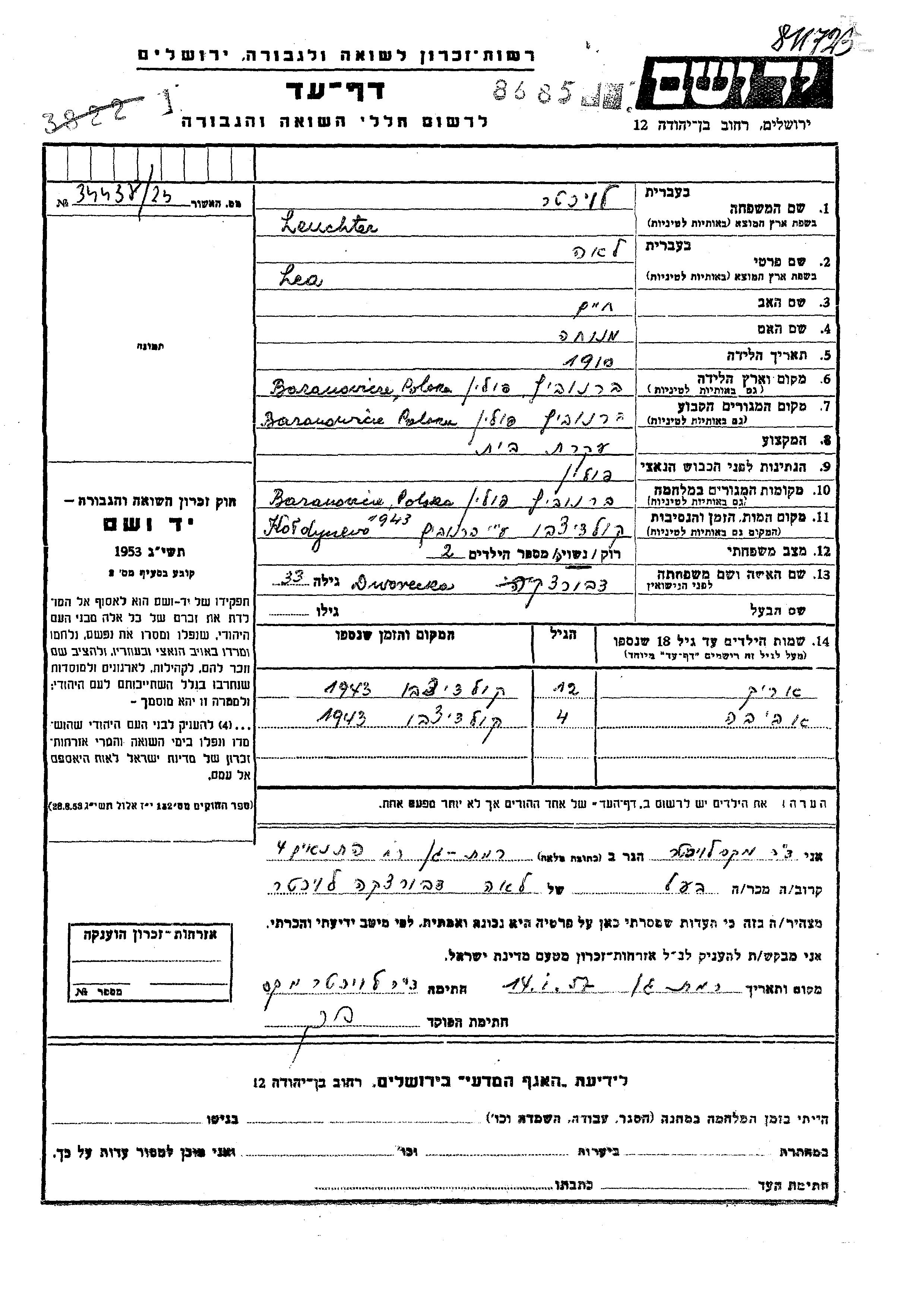 Лойхтер Лея 1910 Барановичи, Польша Лист свидетельских показаний
