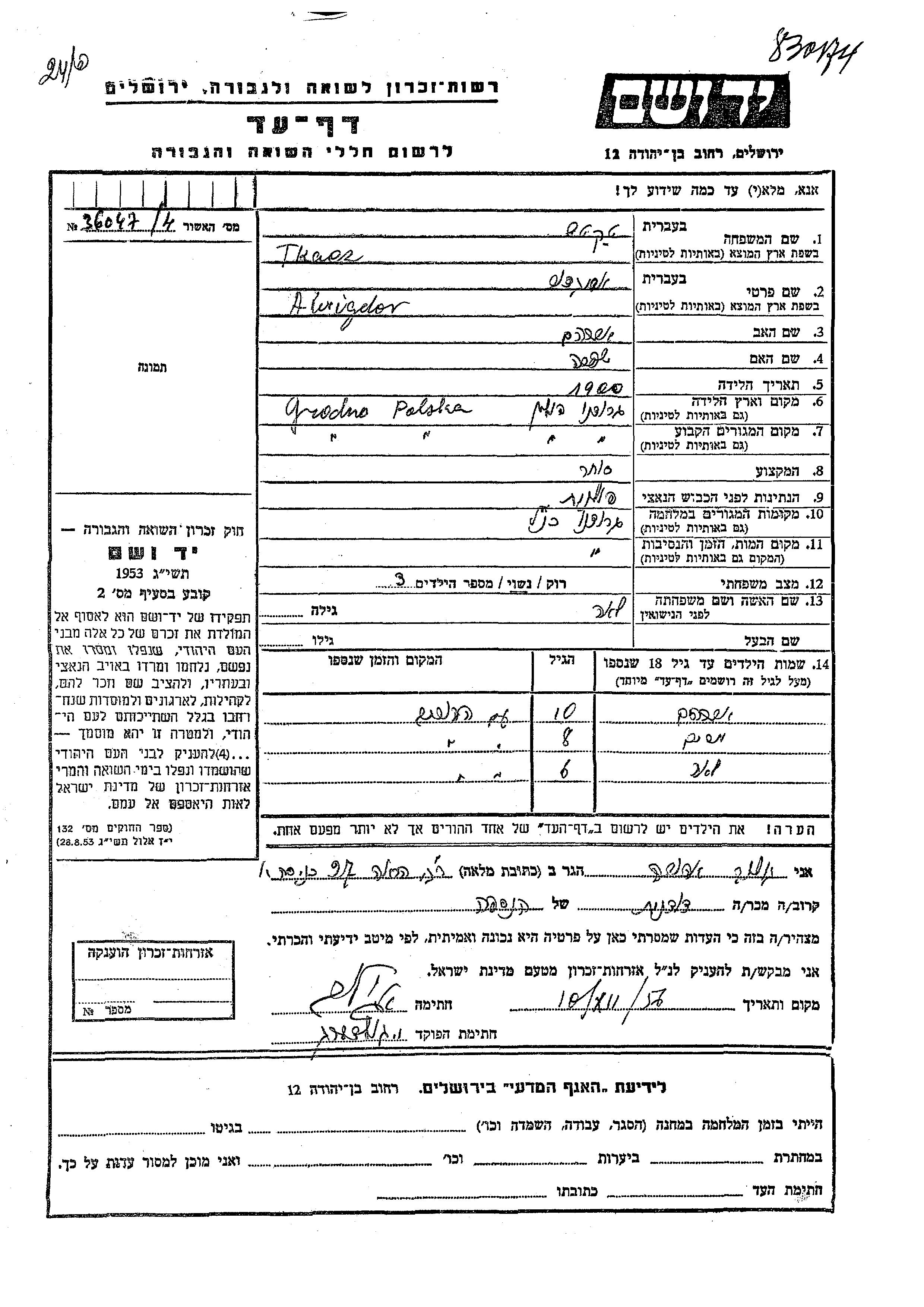 Ткач Авигдор 1900 Гродно, Польша Лист свидетельских показаний