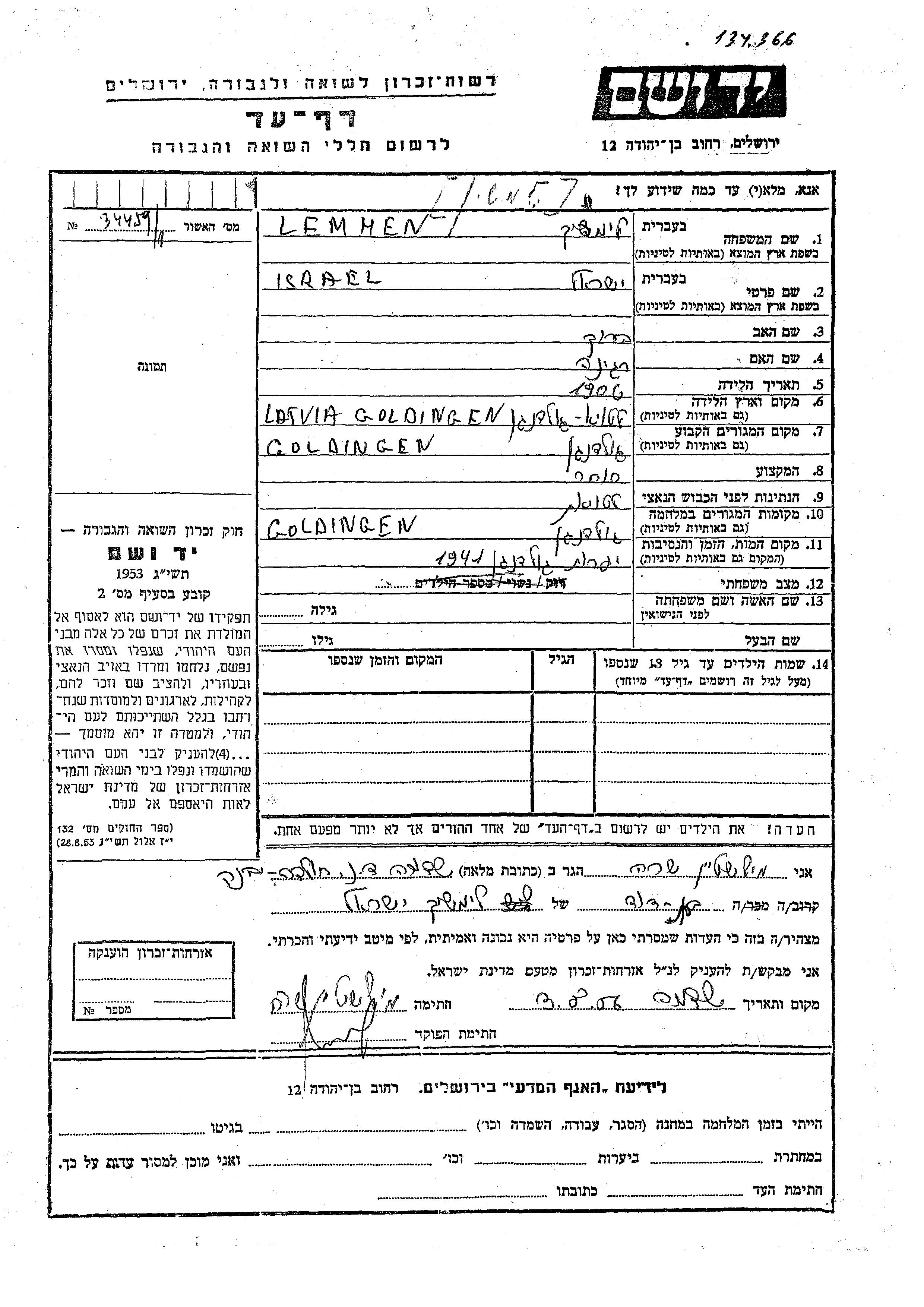 Лемхен Лемшин Исраэль 1906 Голдинген, Латвия Лист свидетельских показаний