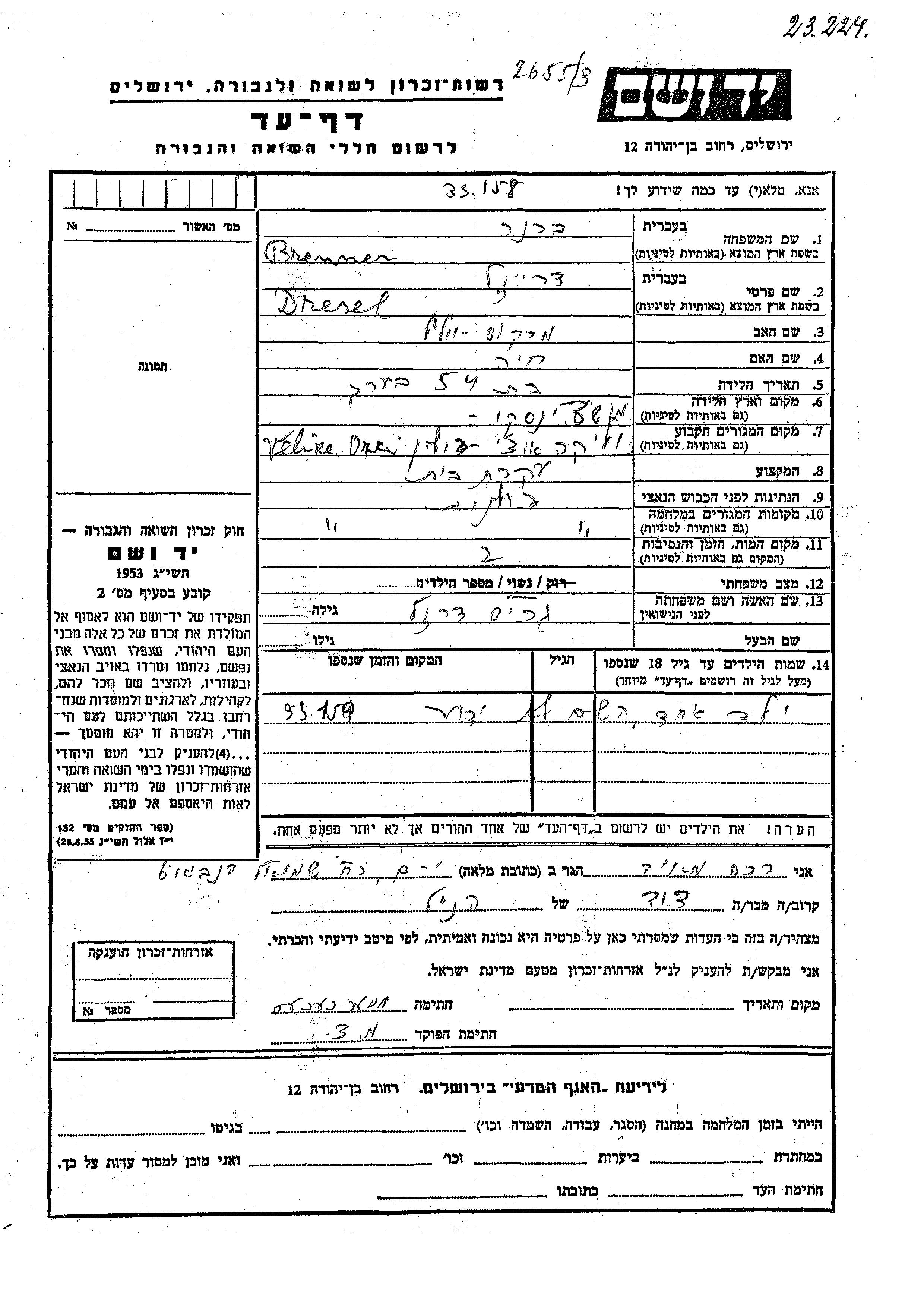 Дрезел Бреннер, девичья фамилия Грис, место рождения: Мостиска, Польша. Отец: Маркус Вольф, mать:Хая. Домохозяйка. Женат / замужем. Место жительства до войны: Вельке-Очи, Польша. Место во время войны: Вельке-Очи, Польша.