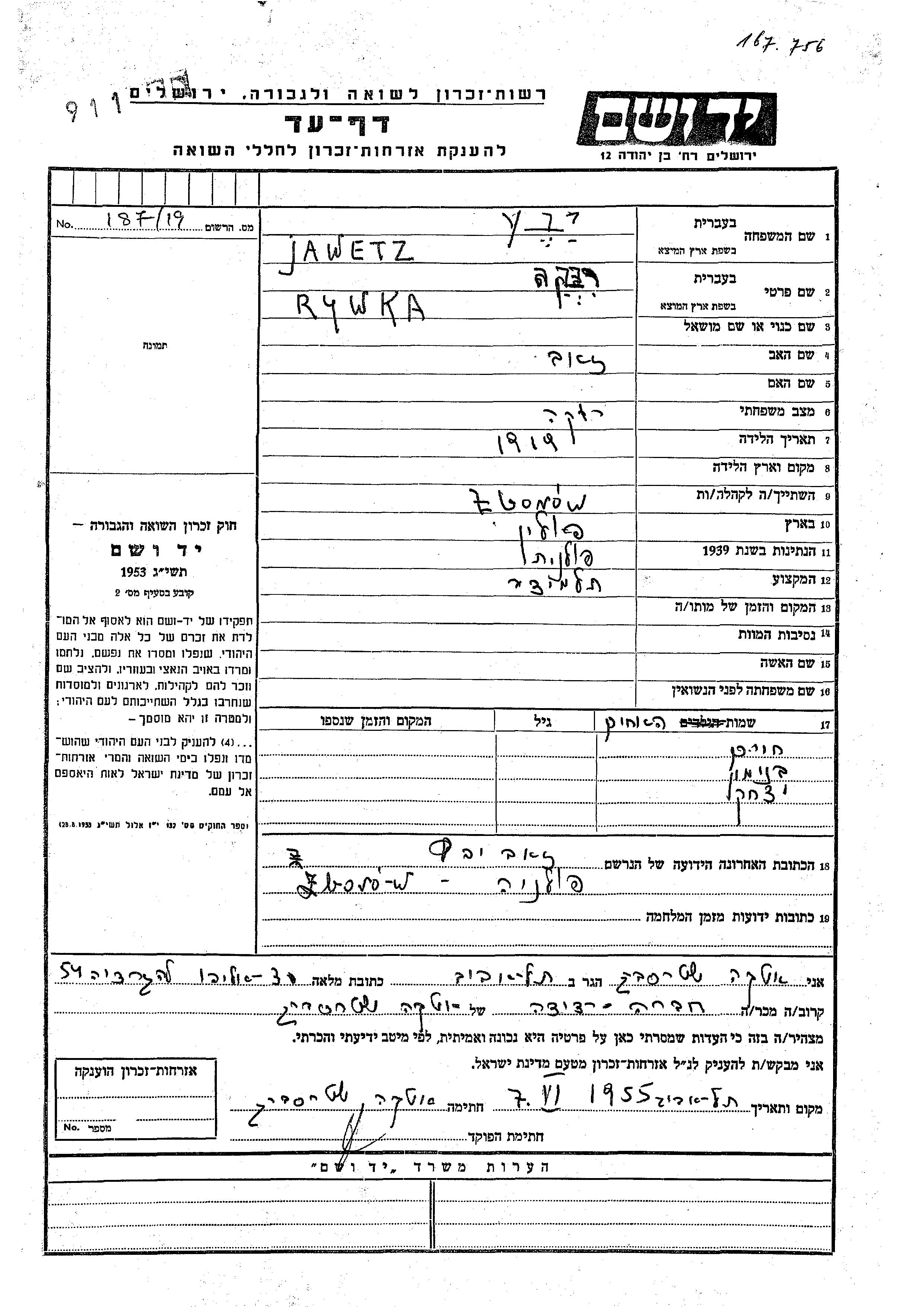 Рывка Явец. Отец: Зеев. Ученик / ученица. Холост / не замужем. Место жительства до войны: Зборов, Польша. Место во время войны: Зборов, Польша.