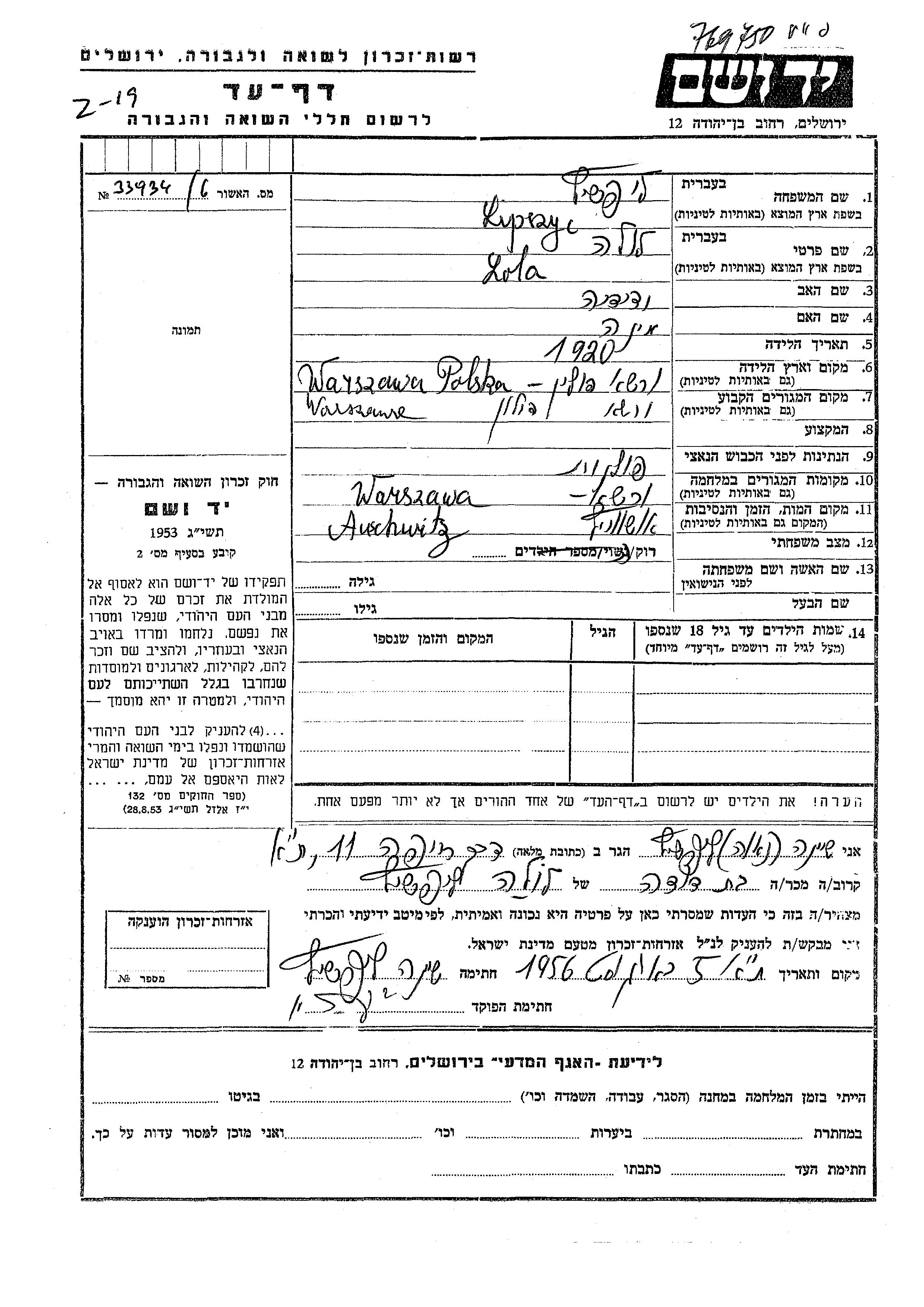 Липшиц Лола 1920 Варшава, Польша Лист свидетельских показаний