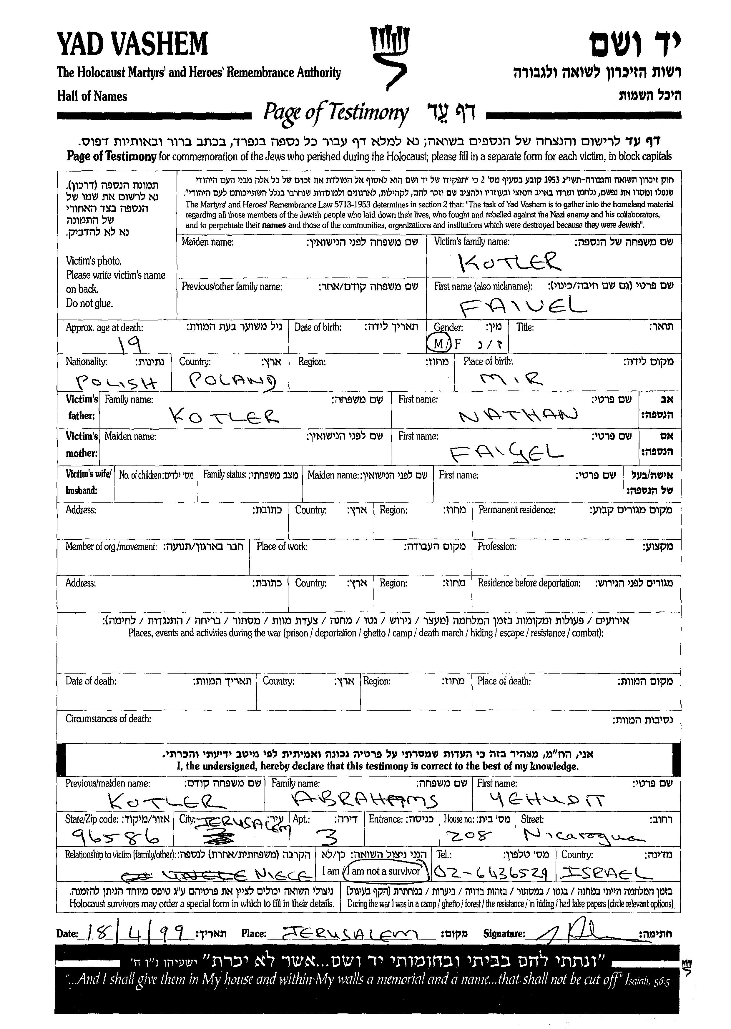 Яд Вашем - Листы свидетельских показаний Мемориального фонда