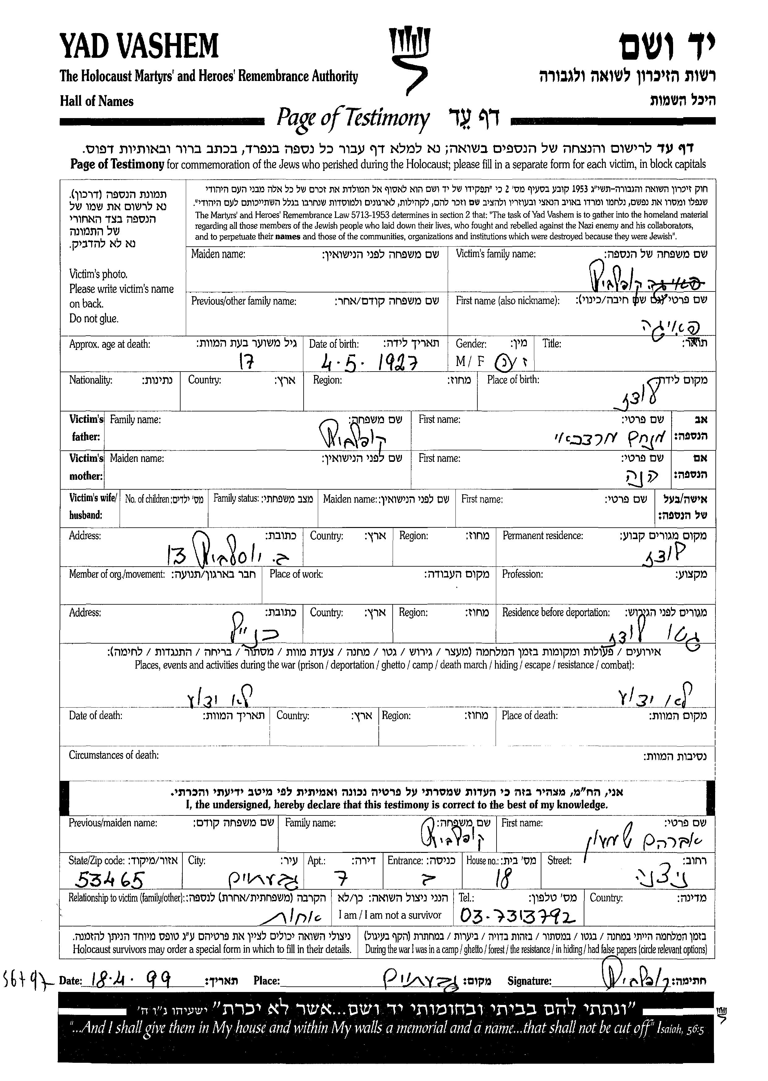 Яд Вашем - Листы свидетельских показаний Мемориального фонда