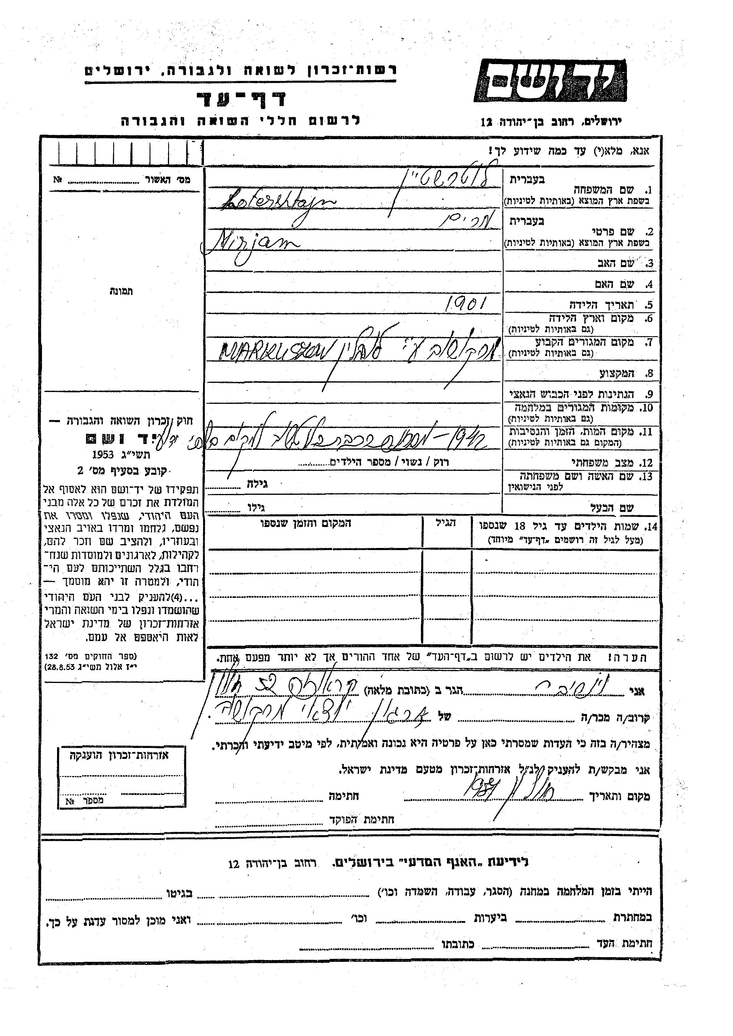 Лотерштайн Мирьям 1901 Маркушув, Польша Лист свидетельских показаний