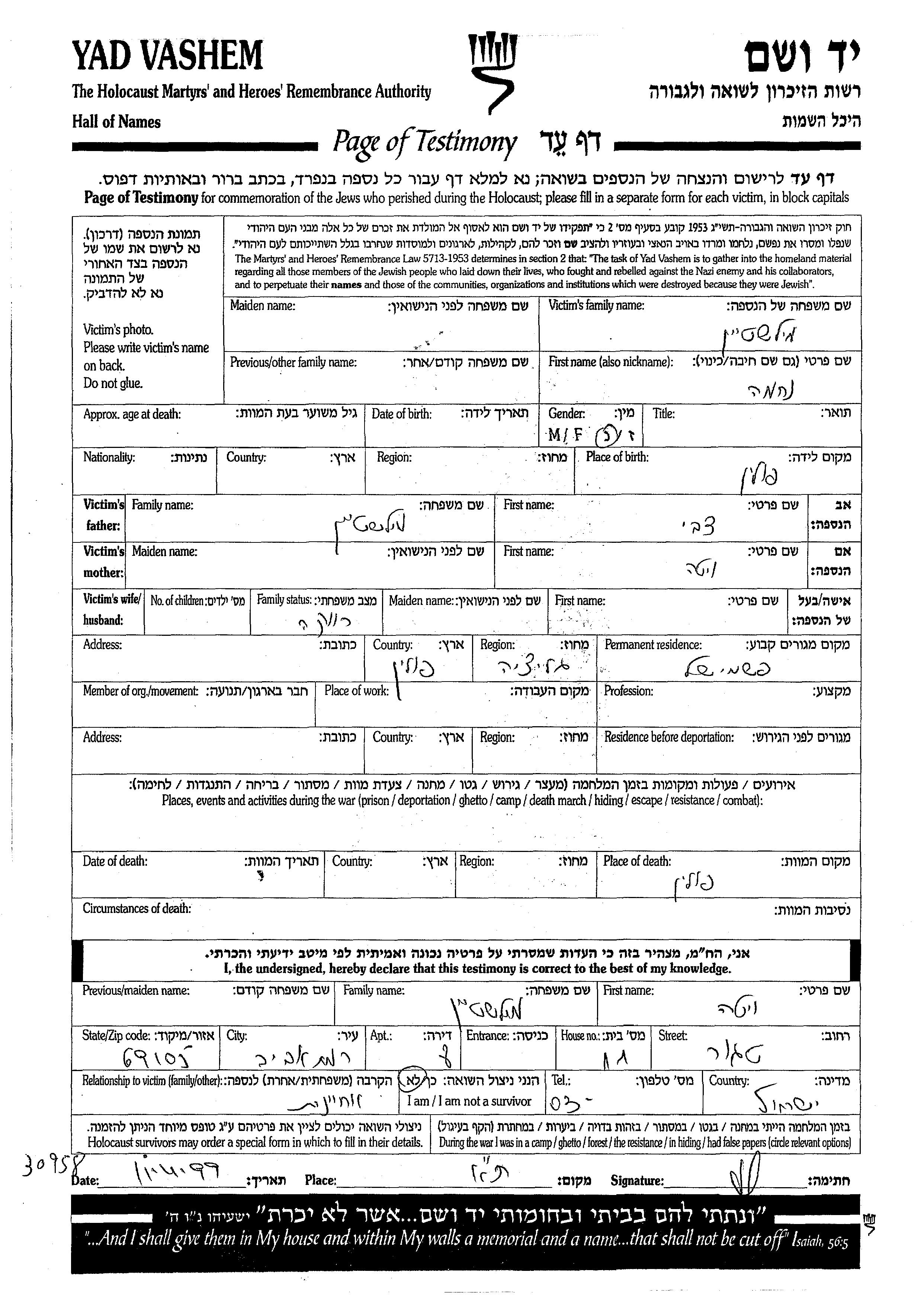 Яд Вашем - Листы свидетельских показаний Мемориального фонда