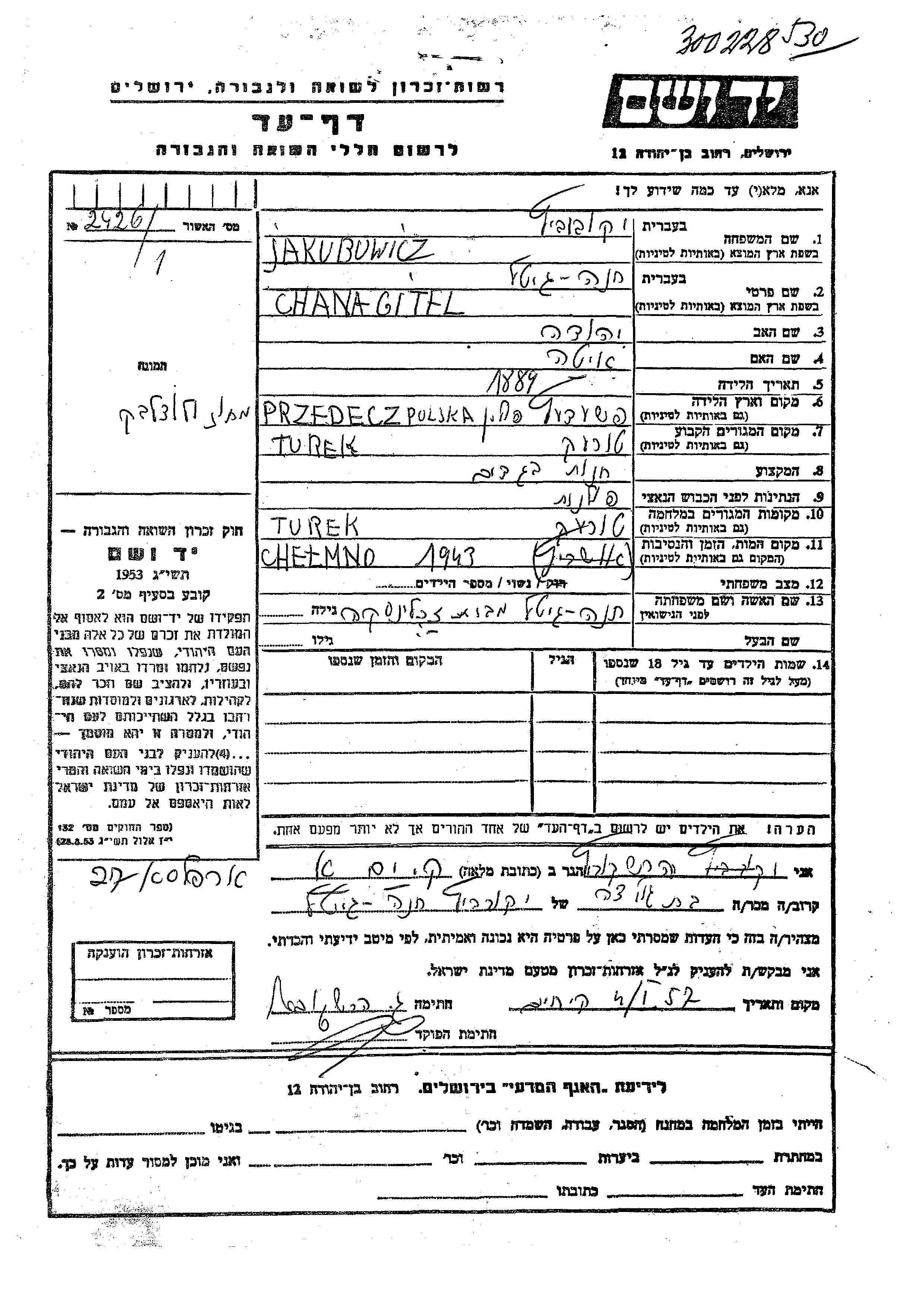 Хана Гитель Якубувич, девичья фамилия Захлински, место рождения: Пшедеч, Польша. Отец: Иегуда, mать:Ита. Женат / замужем. Место жительства до войны: Турек, Польша. Место во время войны: Турек, Польша.