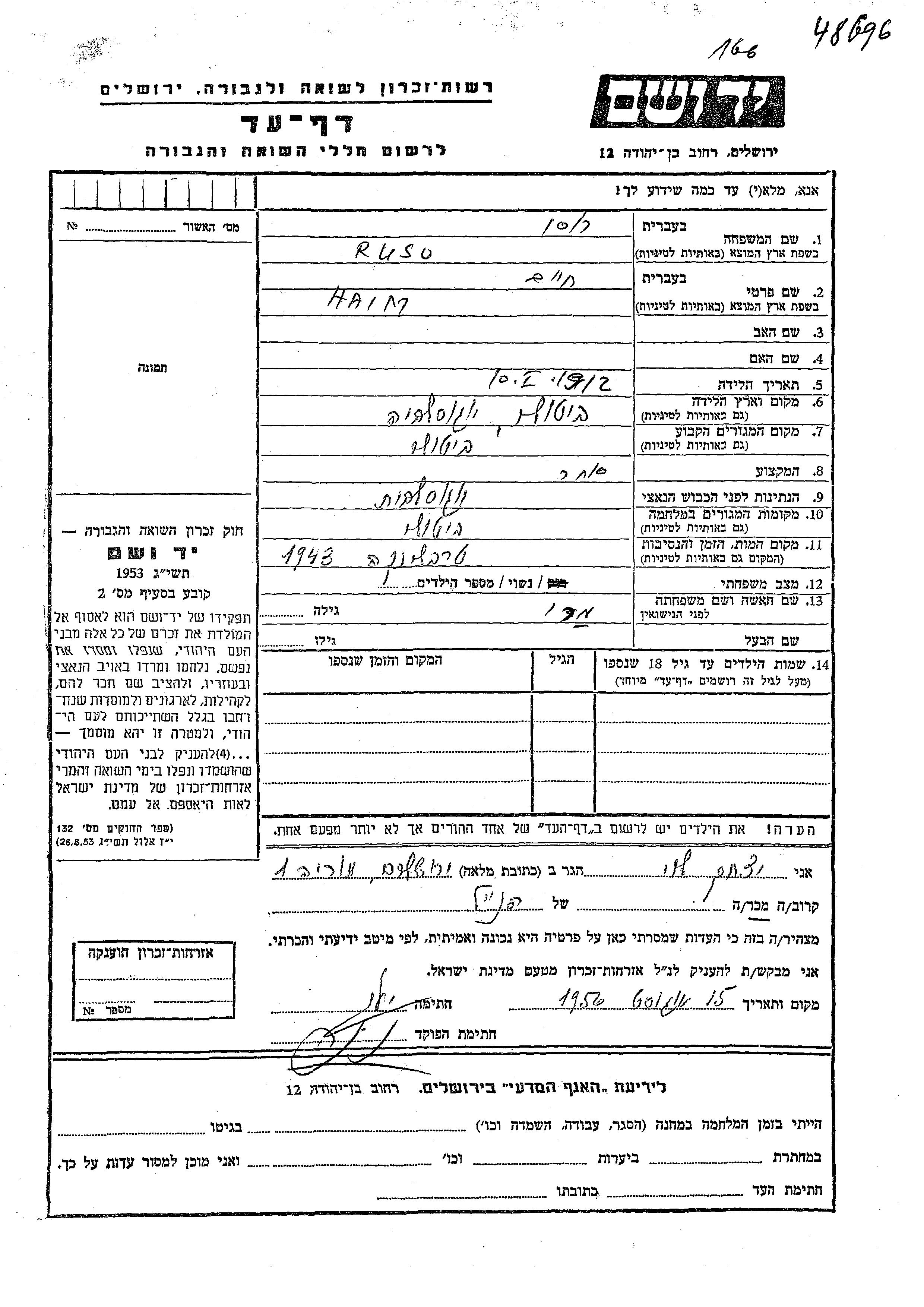 Русо Хаим 1912 Битоль, Югославия Лист свидетельских показаний