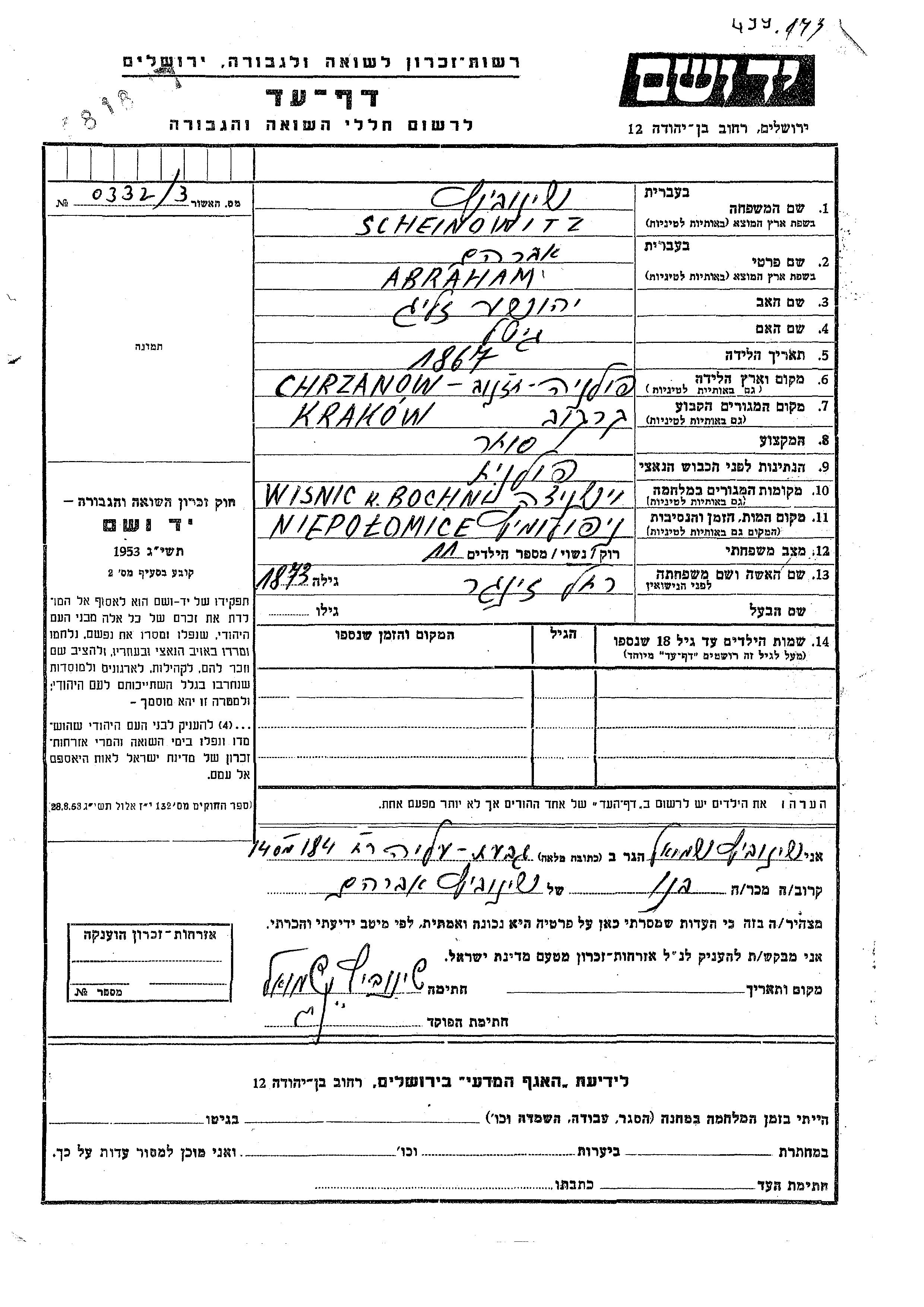 Абраам Шейновиц, место рождения: Хшанув, Польша. Отец: Иегошуа Зелиг, mать:Гитель. Торговец / торговка. Женат / замужем. Место жительства до войны: Краков, Польша. Место во время войны: Вишница, Польша.
