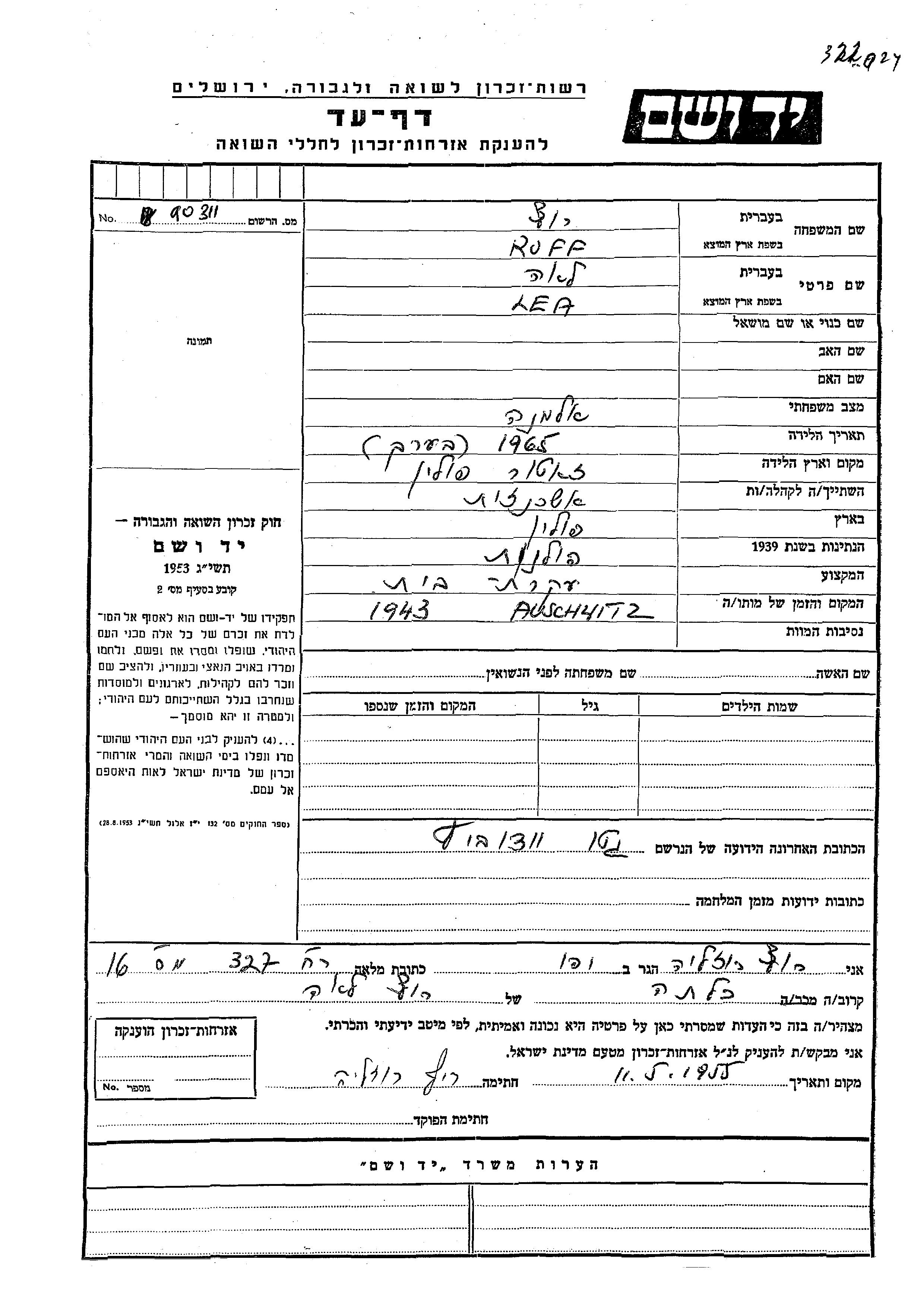 Лея уничтоженa в период Шоа. место смерти: Аушвиц, Польша в 1943.