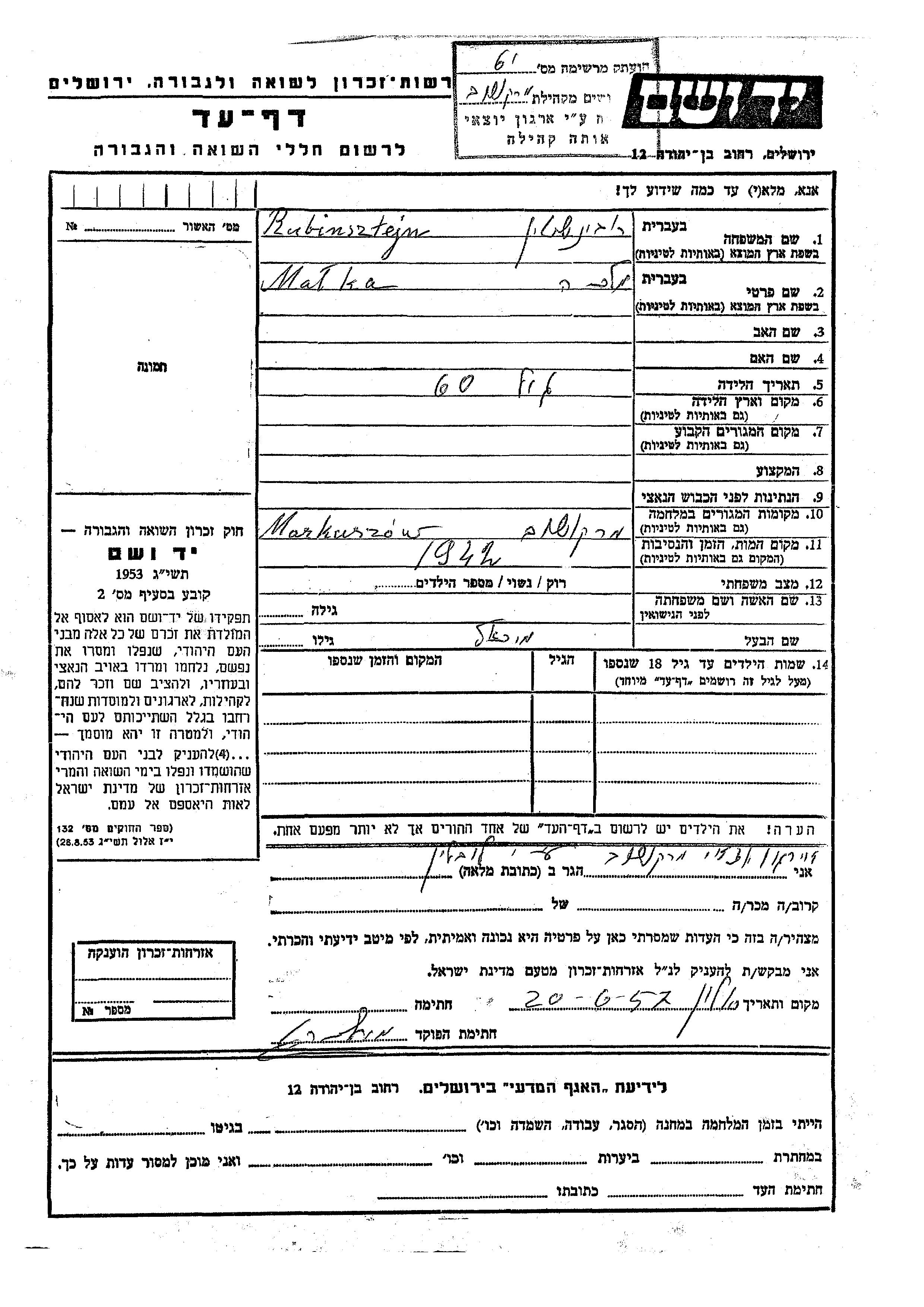 Малка Рубинштейн. Женат / замужем. Место во время войны: Маркушув, Польша.