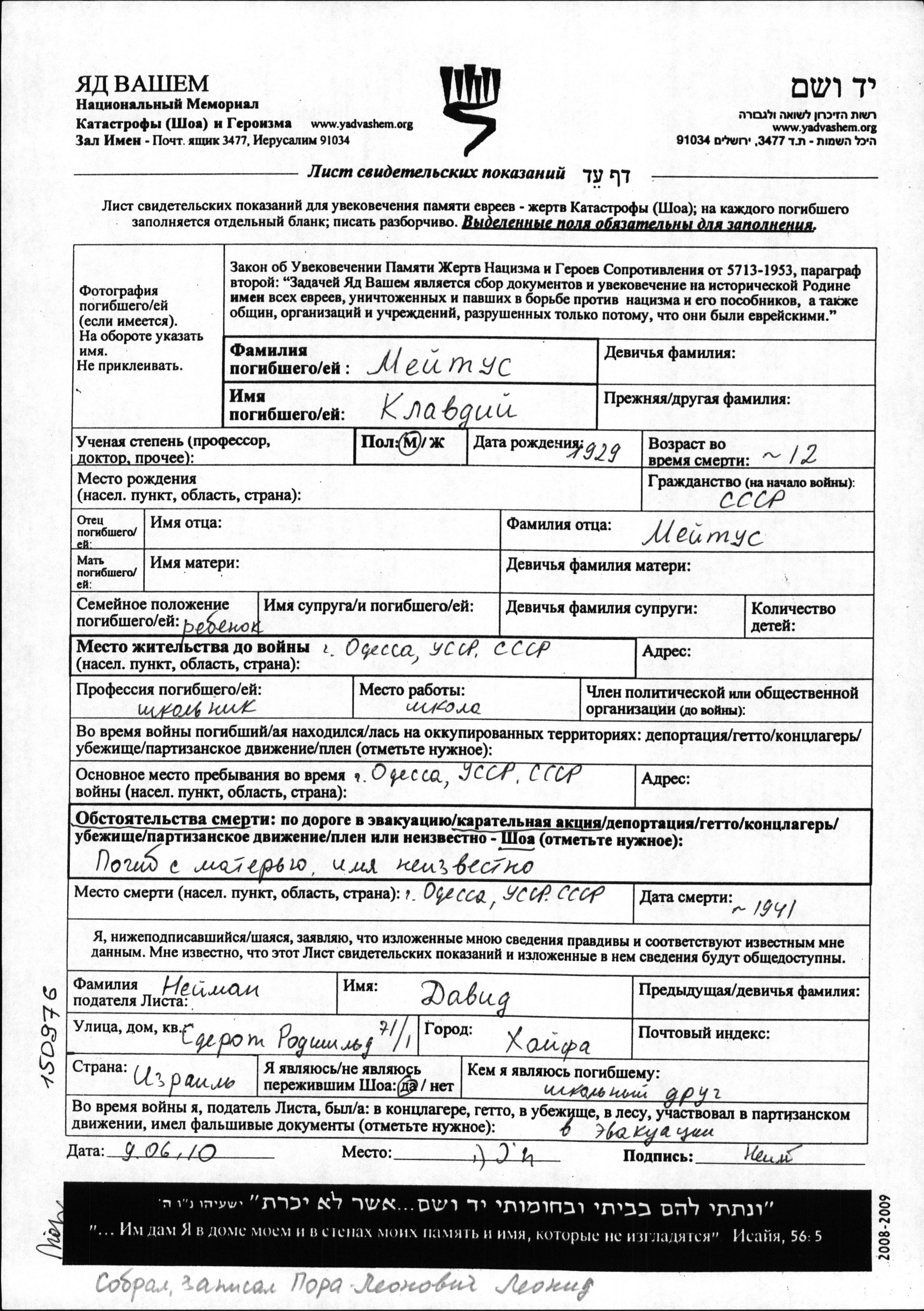 Мейтус Клавдия 1929 Одесса, Украина (СССР) Лист свидетельских показаний
