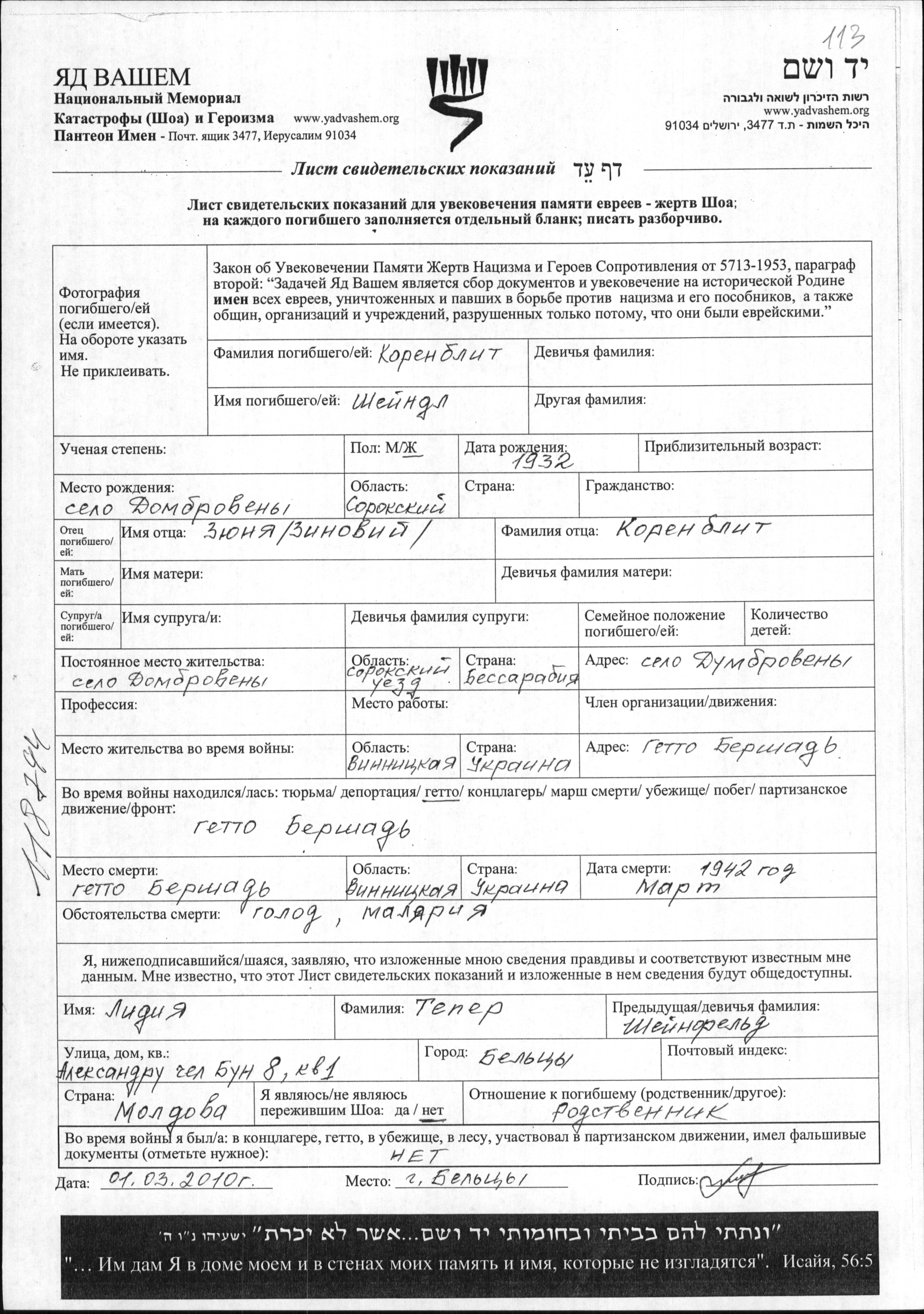 Коренблит Шейндл 1932 Домбровены, Румыния Лист свидетельских показаний
