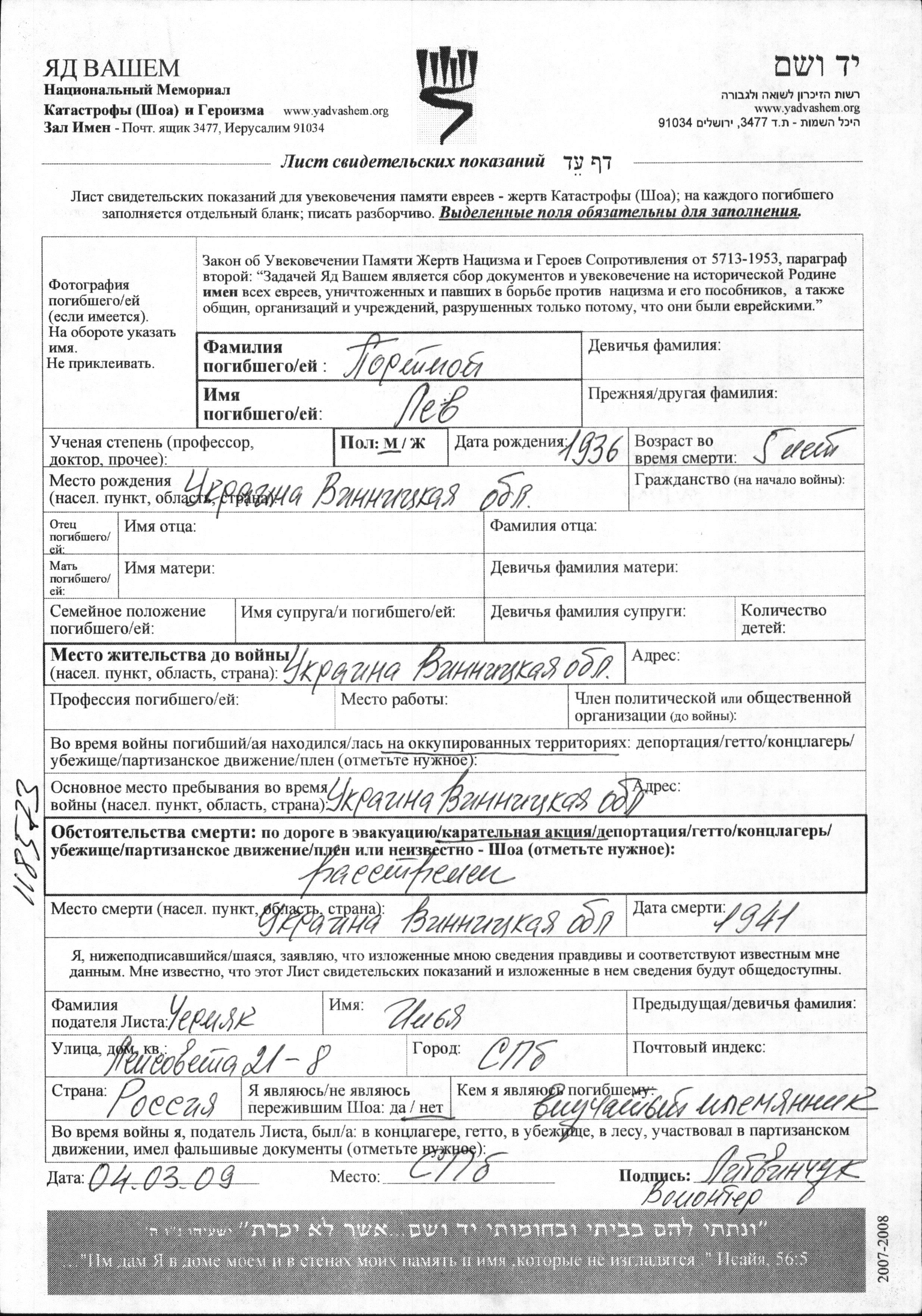 Яд Вашем - Листы свидетельских показаний Мемориального фонда