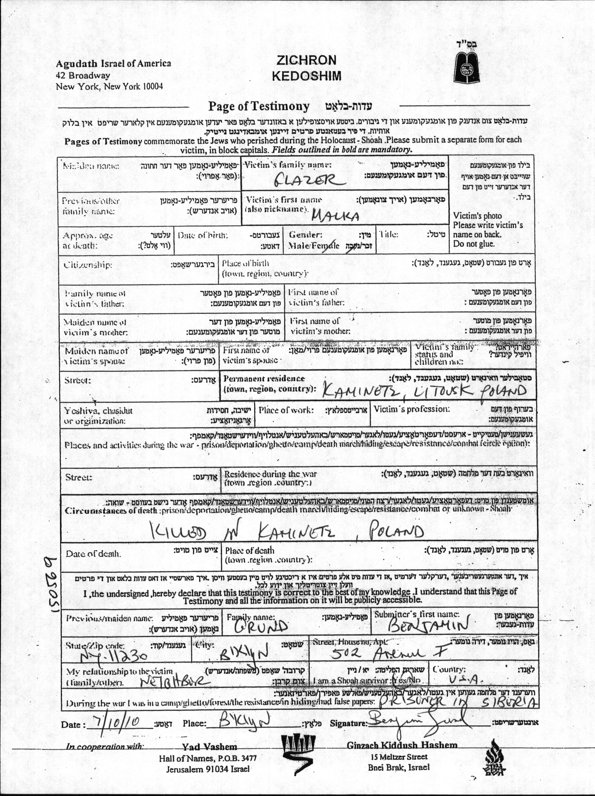 Глазер Малка Каменец-Литовский, Польша Лист свидетельских показаний
