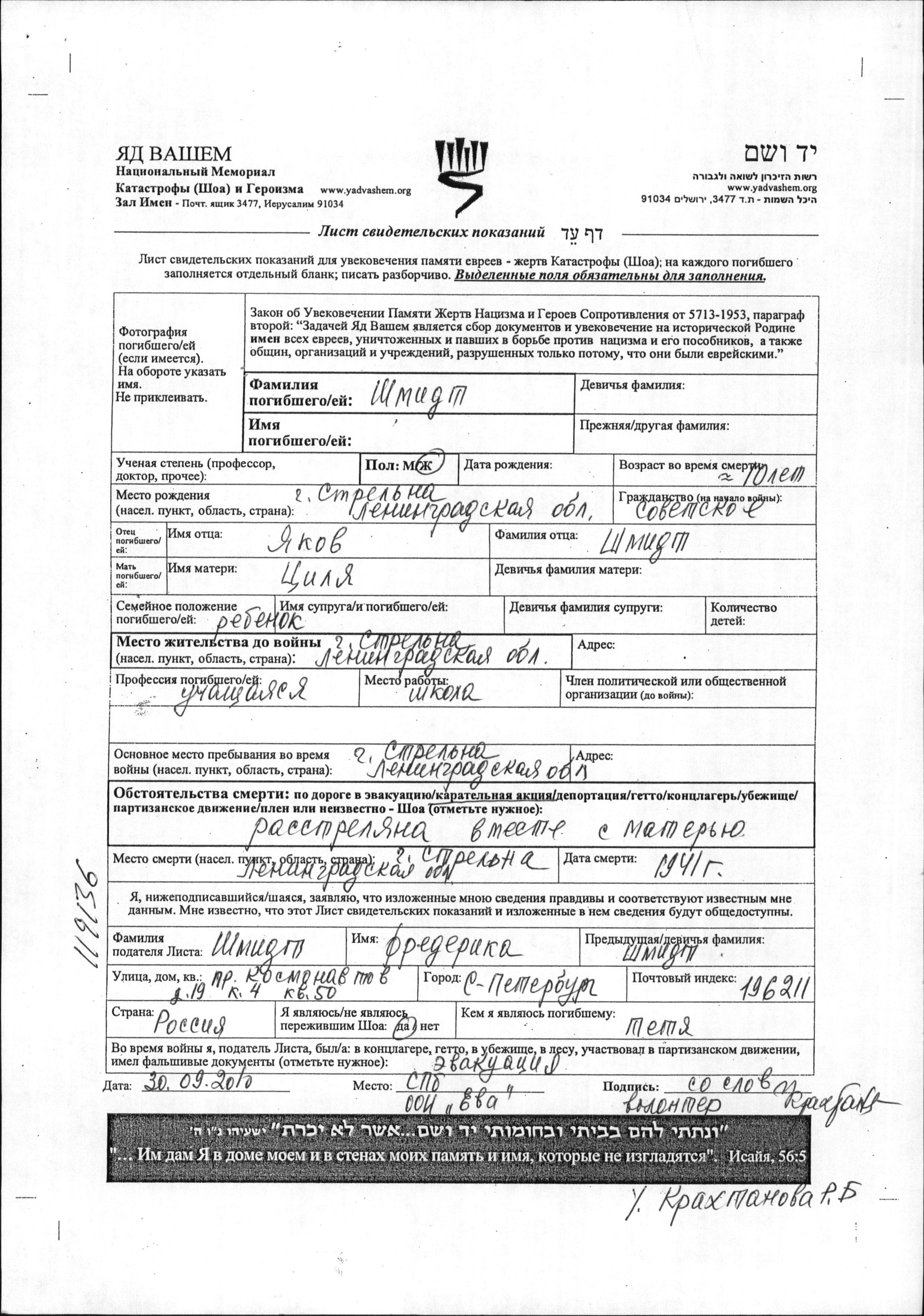 Шмидт Имя неизвестно Стрельна, Россия (СССР) Лист свидетельских показаний