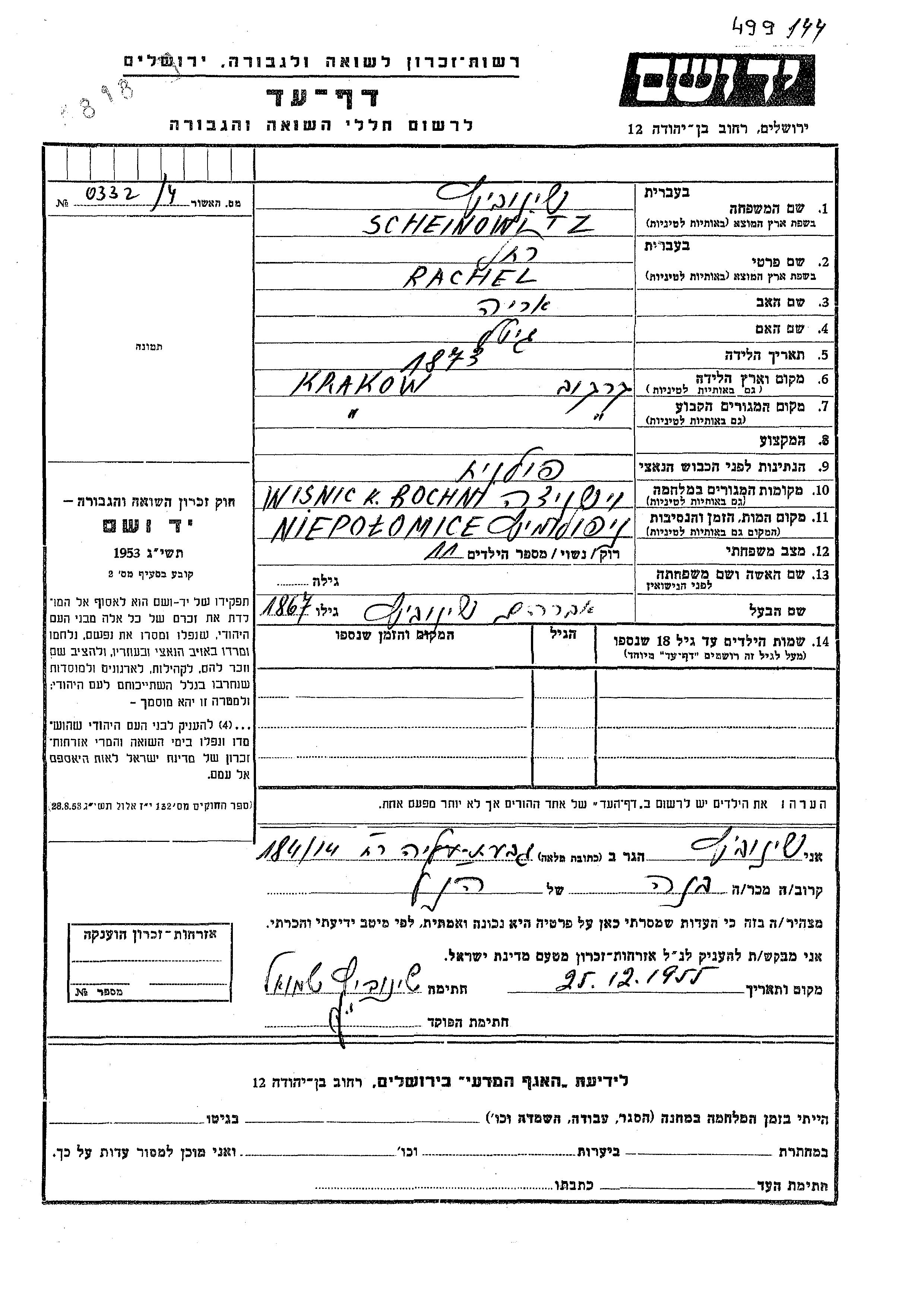 Рахель Шейновиц, место рождения: Краков, Польша. Отец: Арье, mать:Гитель. Женат / замужем. Место жительства до войны: Краков, Польша. Место во время войны: Виснице, Польша.