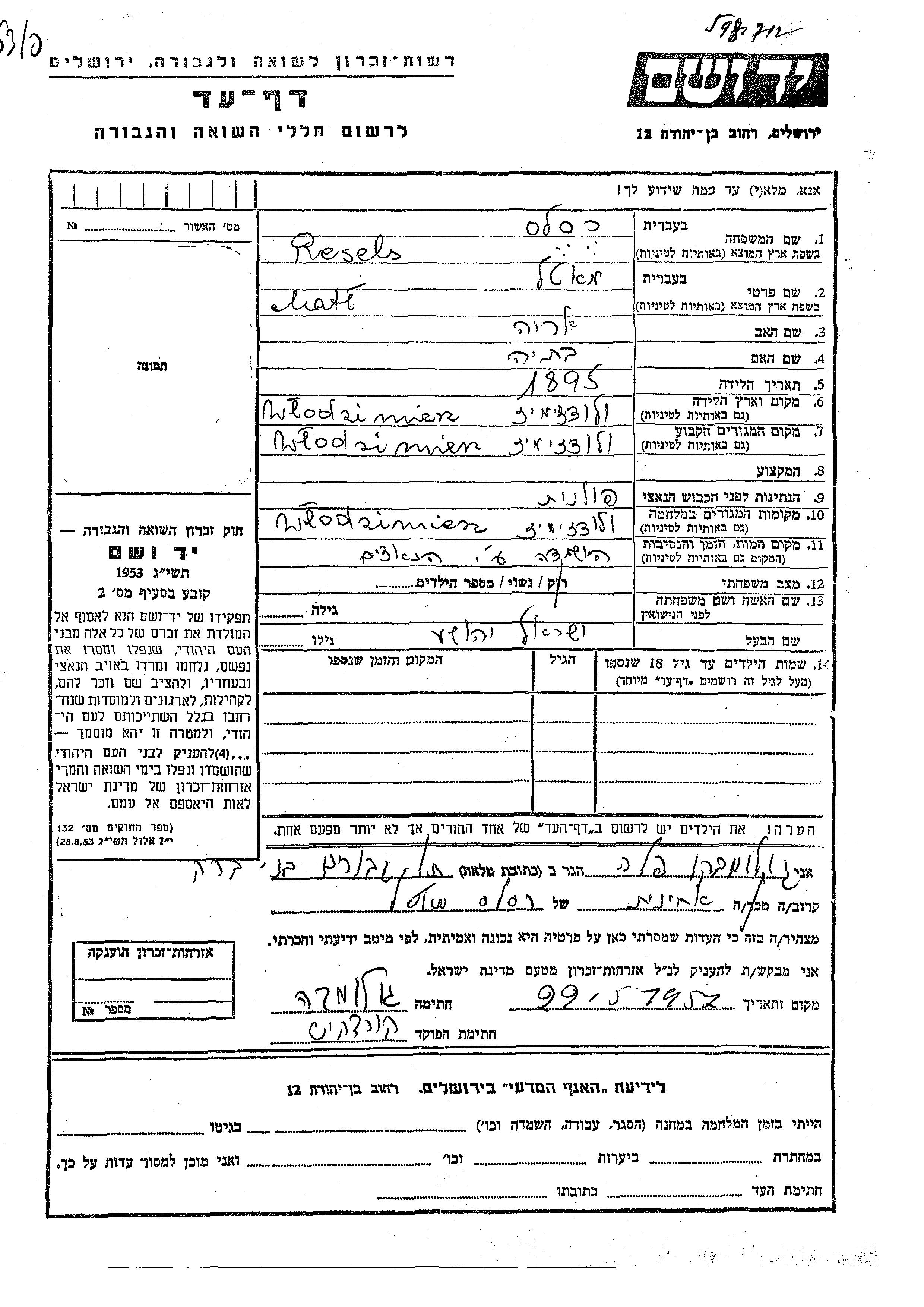 Матл Реселс, место рождения: Влодзимеж, Польша. Отец: Арье, mать:Батья. Женат / замужем. Место жительства до войны: Влодзимеж, Польша. Место во время войны: Влодзимеж, Польша.