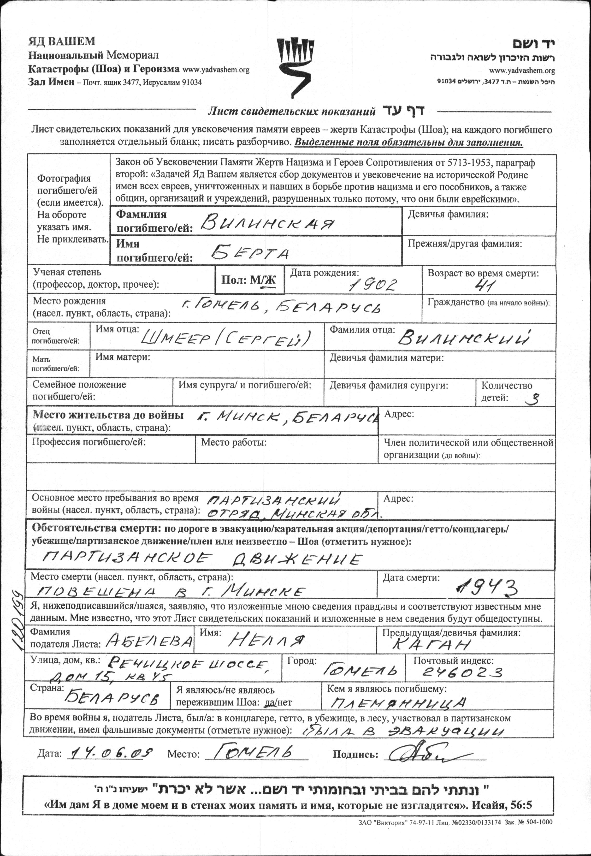 Вилинская Берта 1902 Минск, Белоруссия (СССР) Лист свидетельских показаний