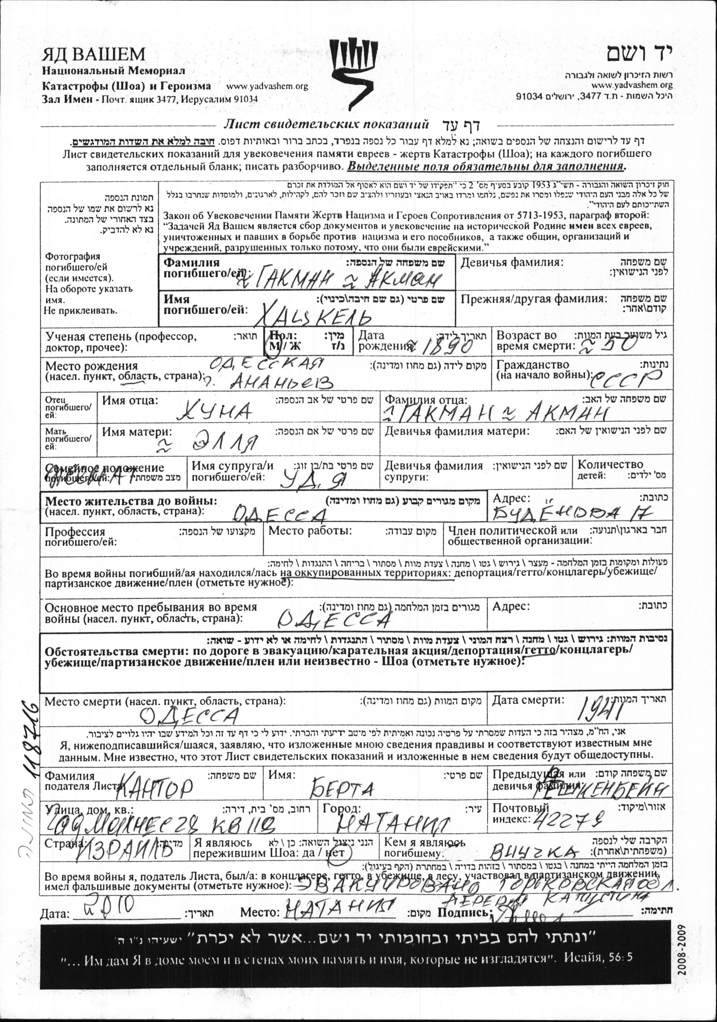 Яд Вашем - Листы свидетельских показаний Мемориального фонда