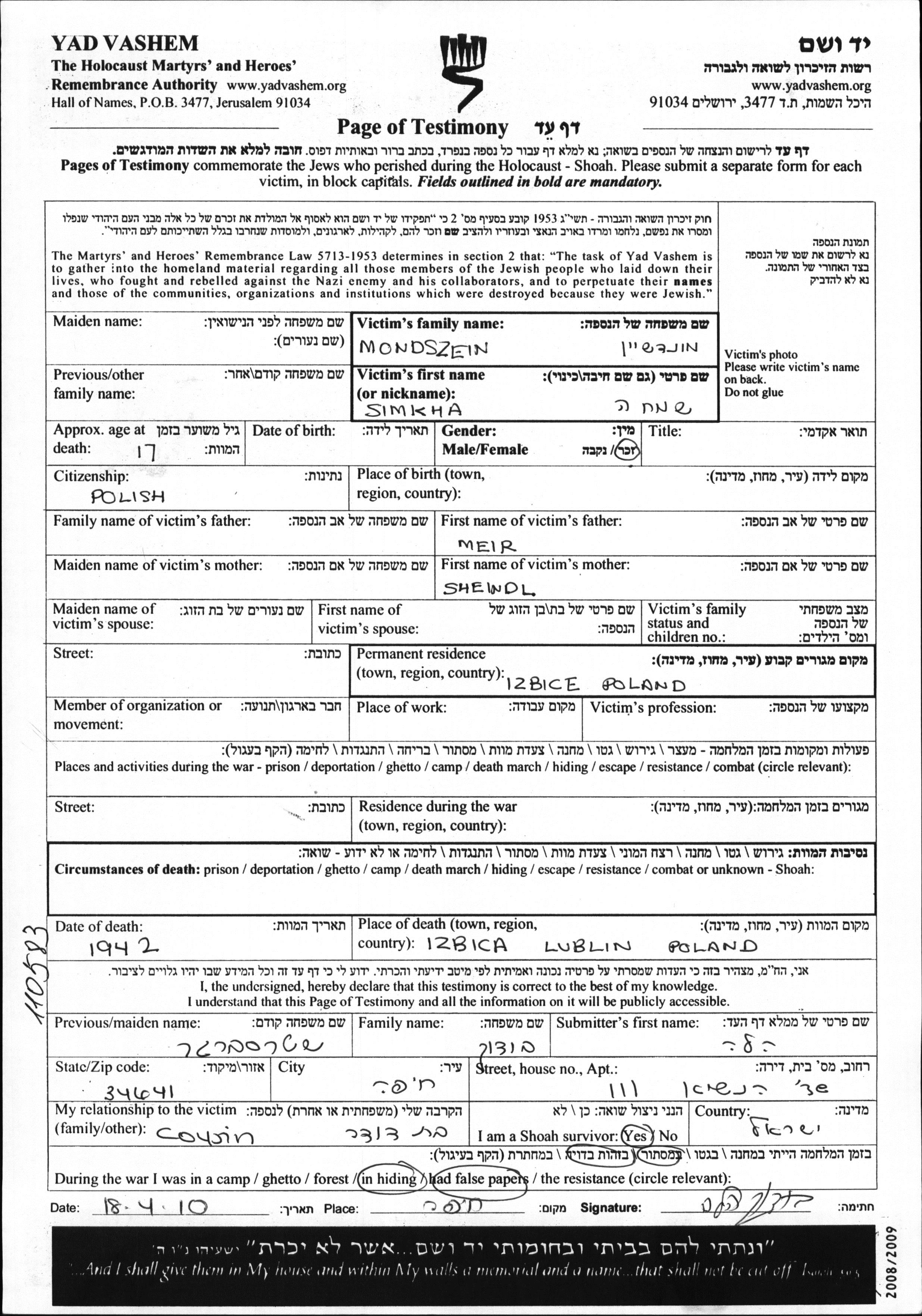 Во время Шоа евреев уничтожали разными способами: газовые камеры, расстрелы, их заживо хоронили или сжигали, непосильным принудительным трудом, голодом, эпидемиями, отсутствием минимальных гигиенических условий и медицинского обслуживания, и т.д. Некоторые евреи добровольно расстались со своей жизнью, чтобы избежать ареста и дальнейших преследований или чтобы покончить с безысходностью и бесконечными страданиями.