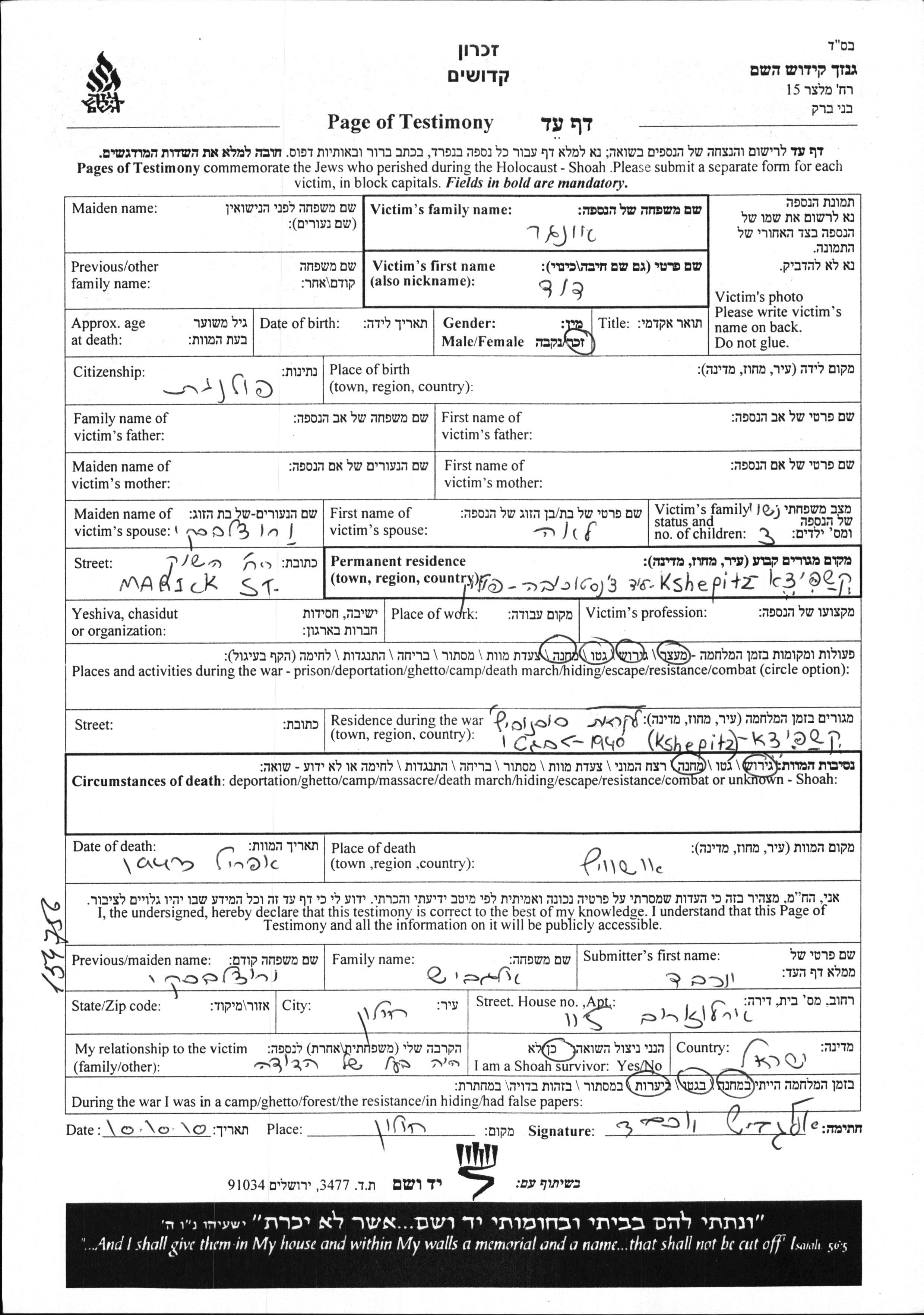 Яд Вашем - Листы свидетельских показаний Мемориального фонда