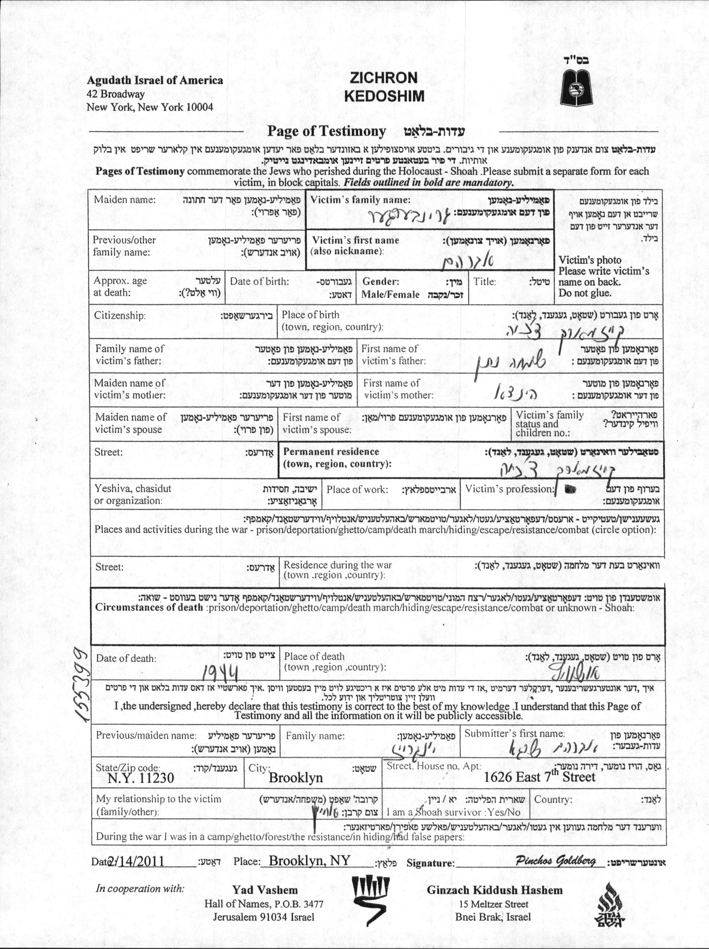 Яд Вашем - Листы свидетельских показаний Мемориального фонда